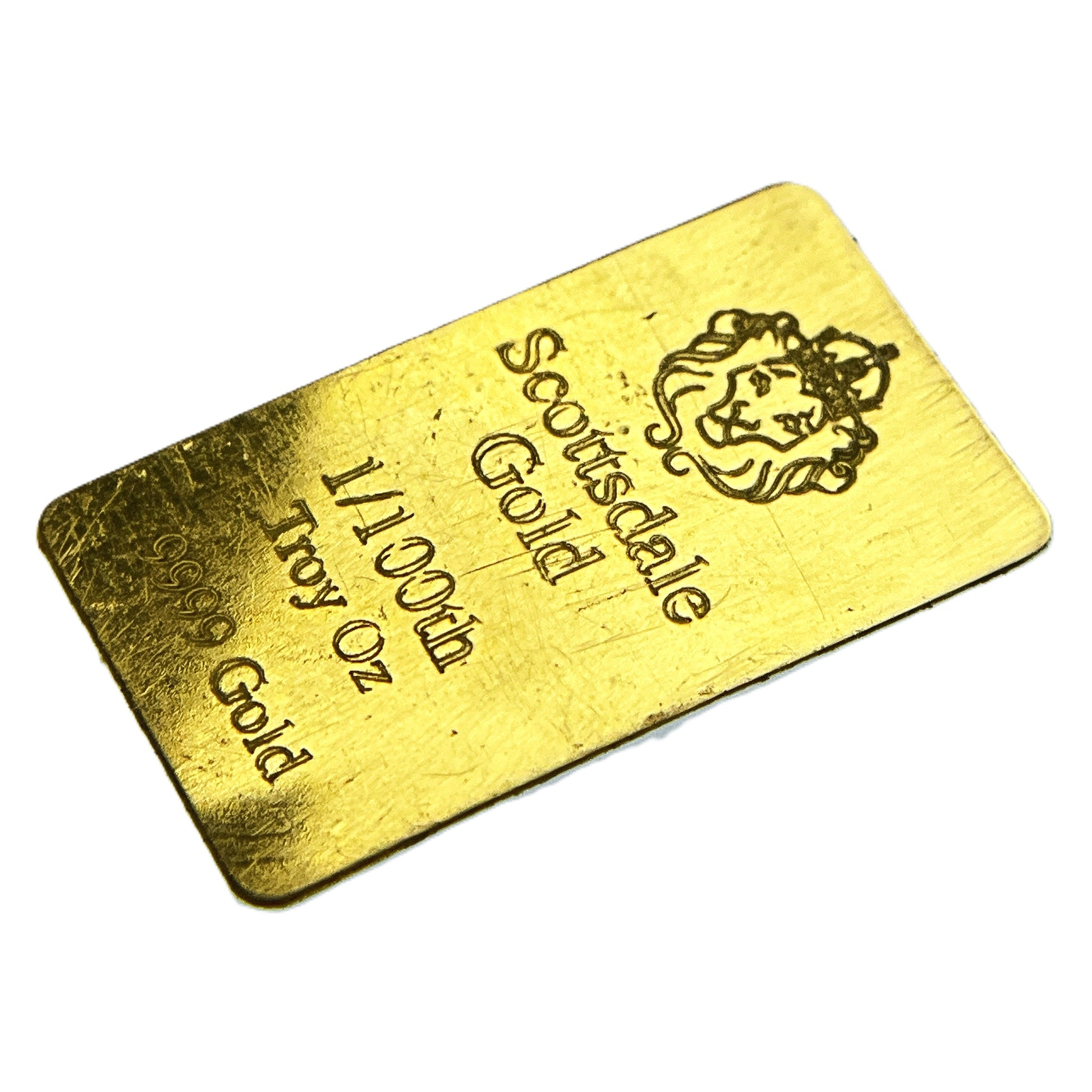 This is a 1/100th Troy Ounce Scottsdale Gold bar, which is widely recognized as the smallest mass-produced gold bar in the world.