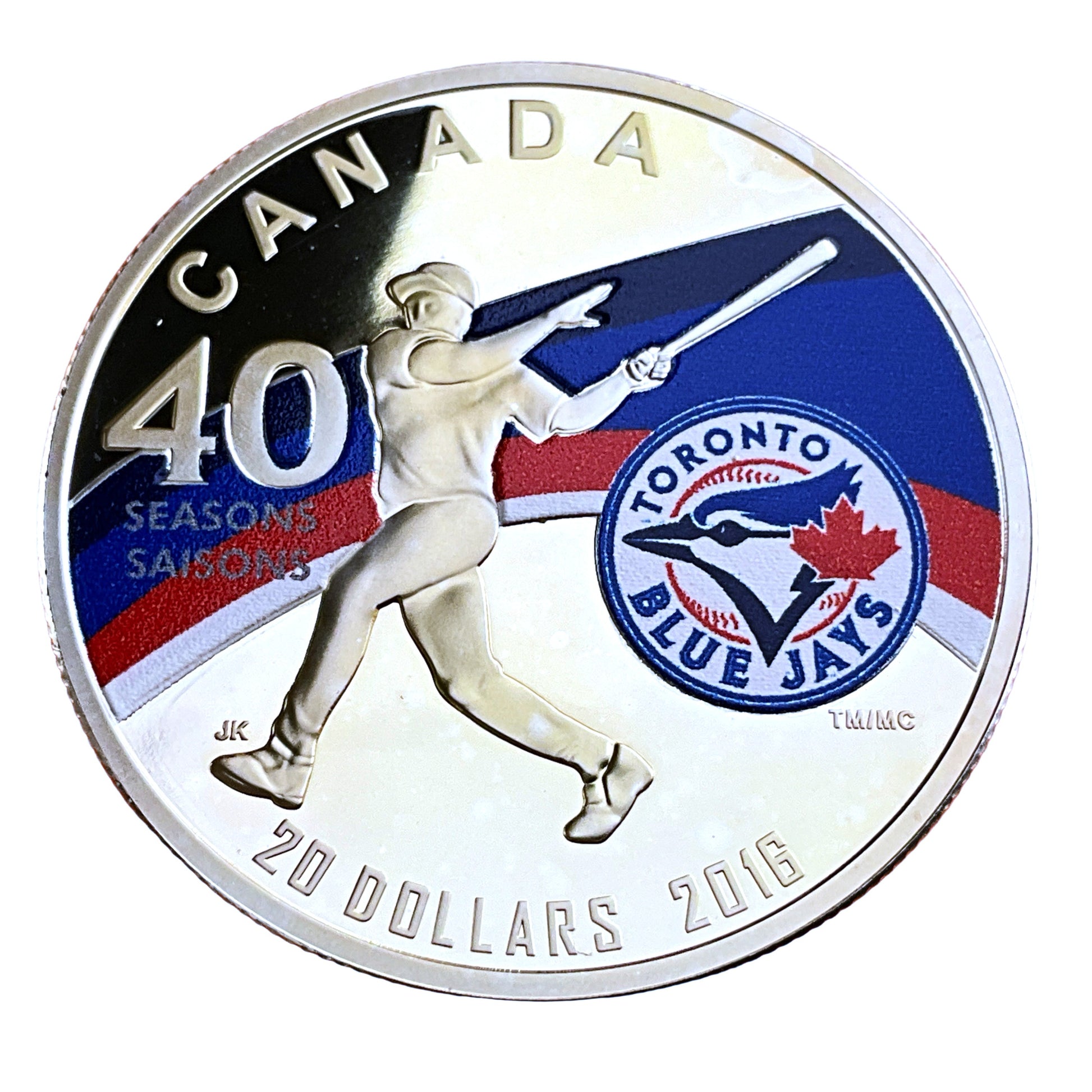 The image shows the 2016 Royal Canadian Mint $20 fine silver coin commemorating the 40th season of the Toronto Blue Jays.