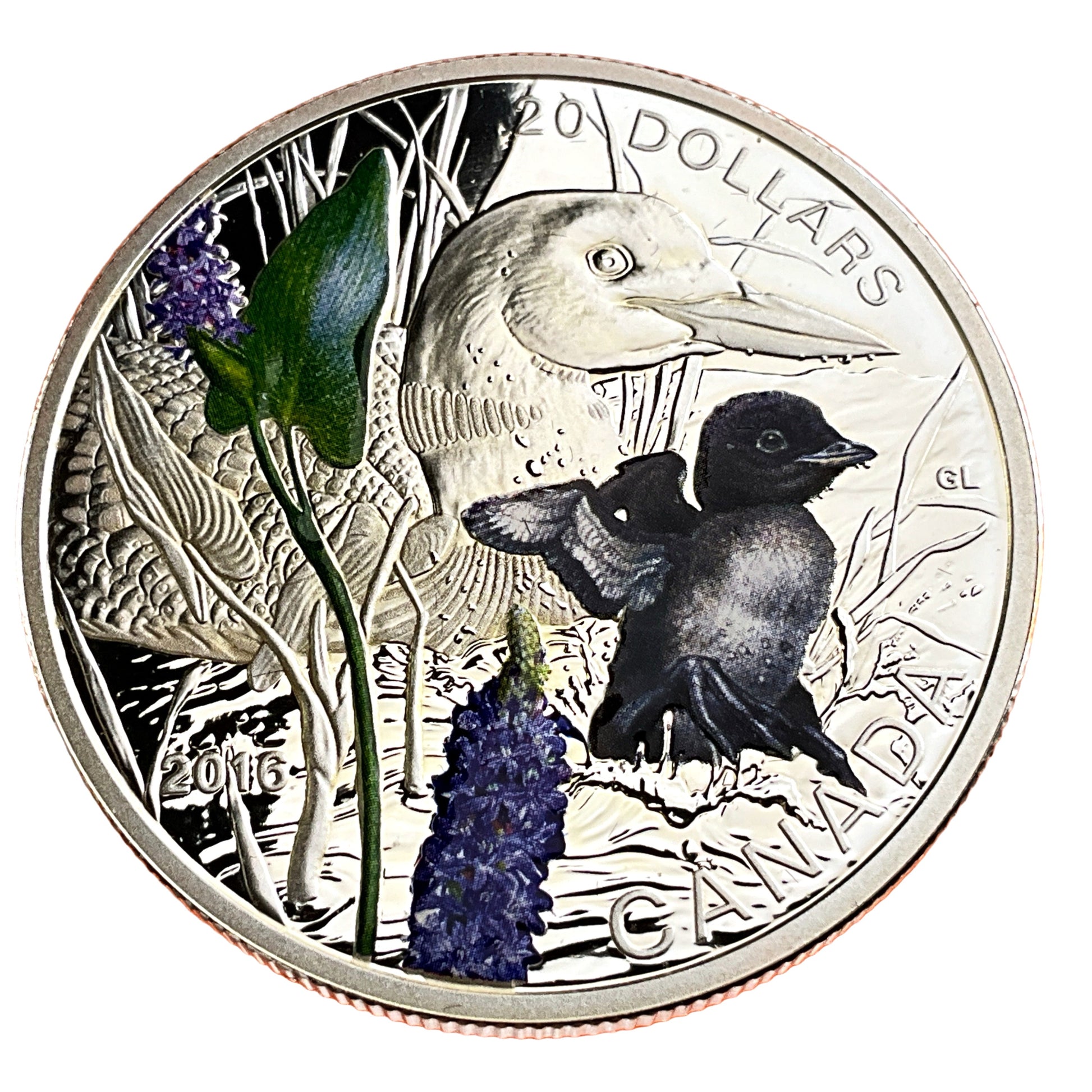 Design: The coin showcases a baby common loon (chick) with its mother in a Canadian lake, with selective color highlighting the baby loon and surrounding pickerelweed flowers.