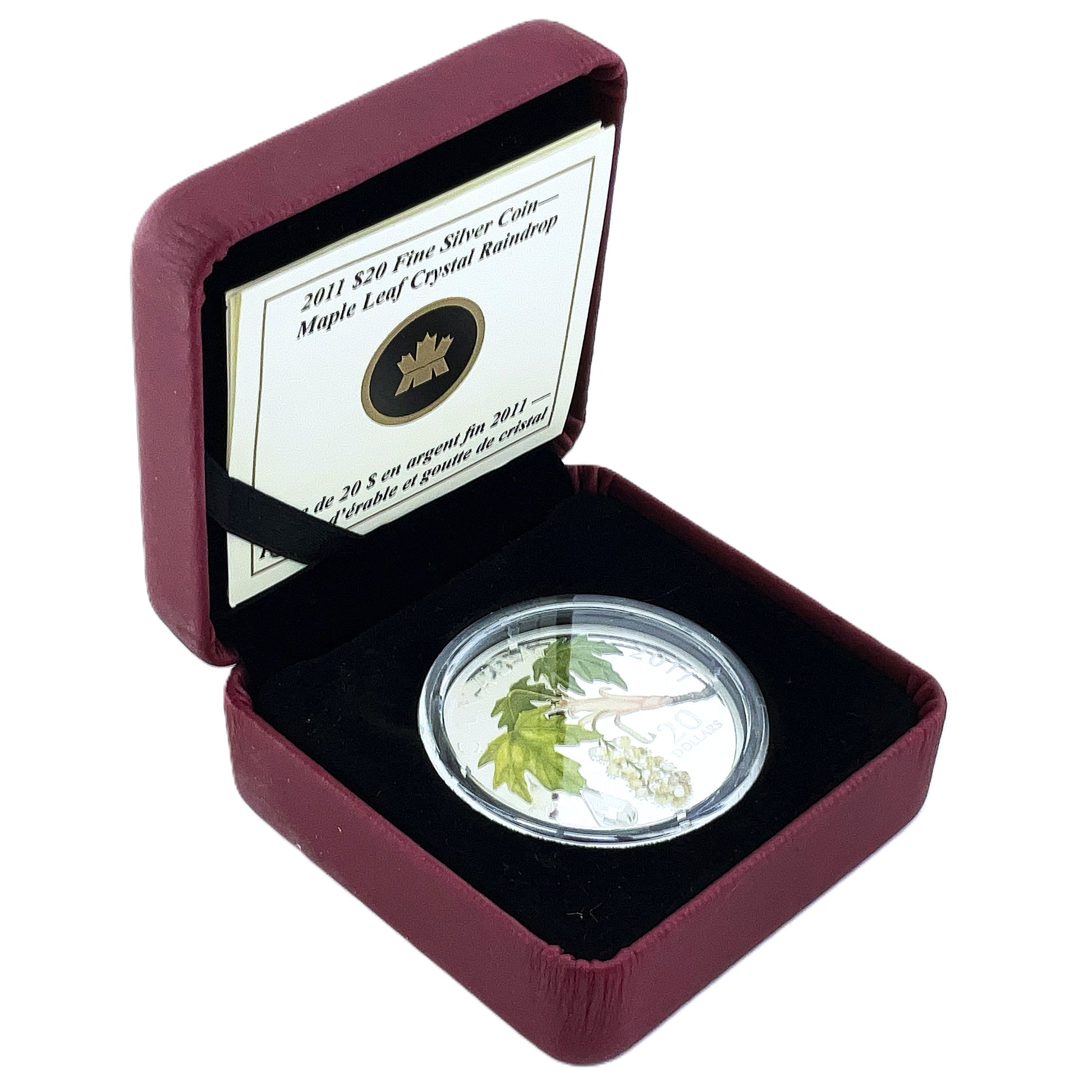This coin is a 2011 Canada $20 Fine Silver Maple Leaf Crystal Raindrop.