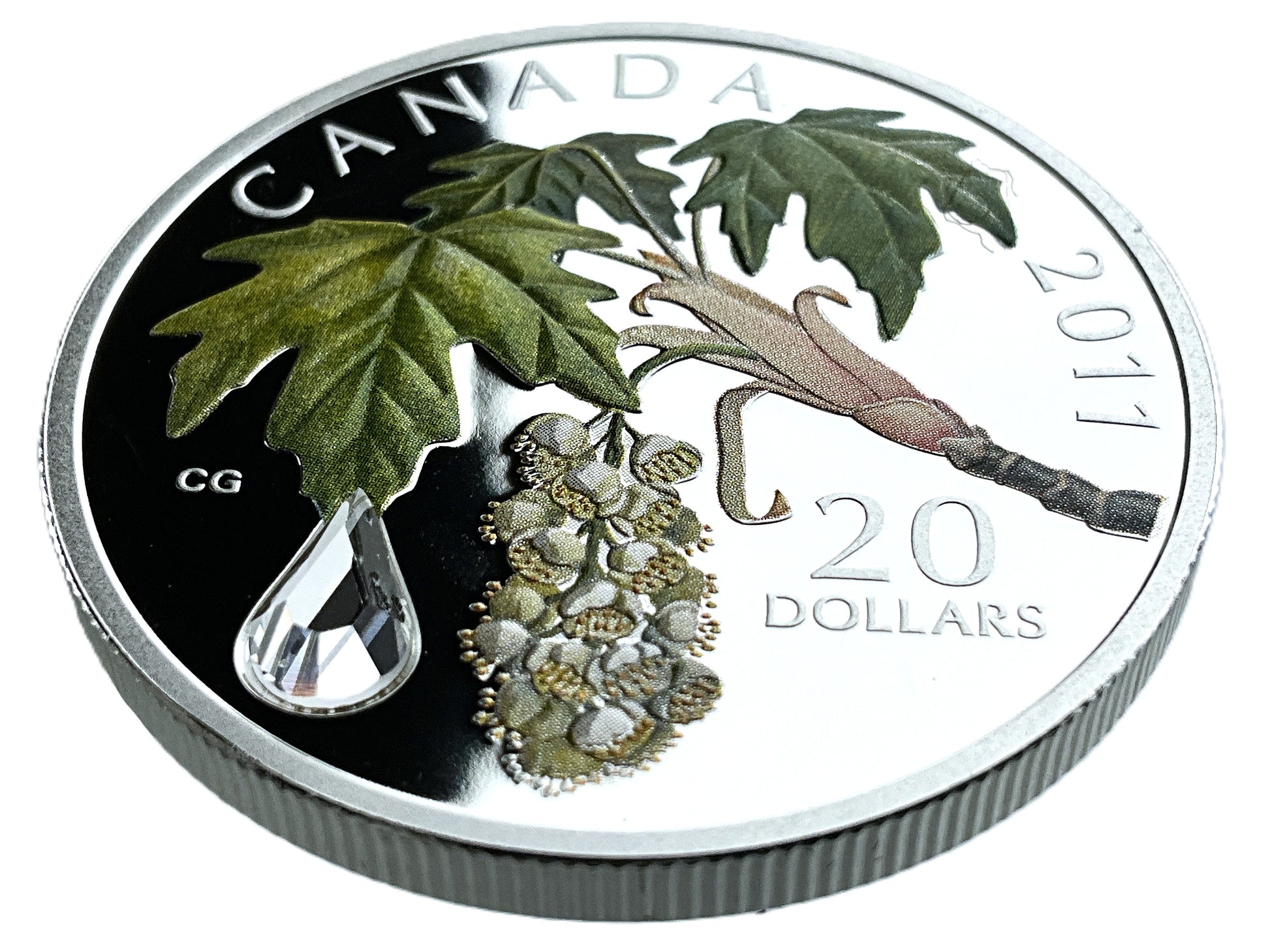 The coin is part of the Crystal Raindrop series produced by the Royal Canadian Mint. Its design features the leaves and flowers of a Bigleaf Maple with a Swarovski crystal raindrop dripping from a leaf tip.