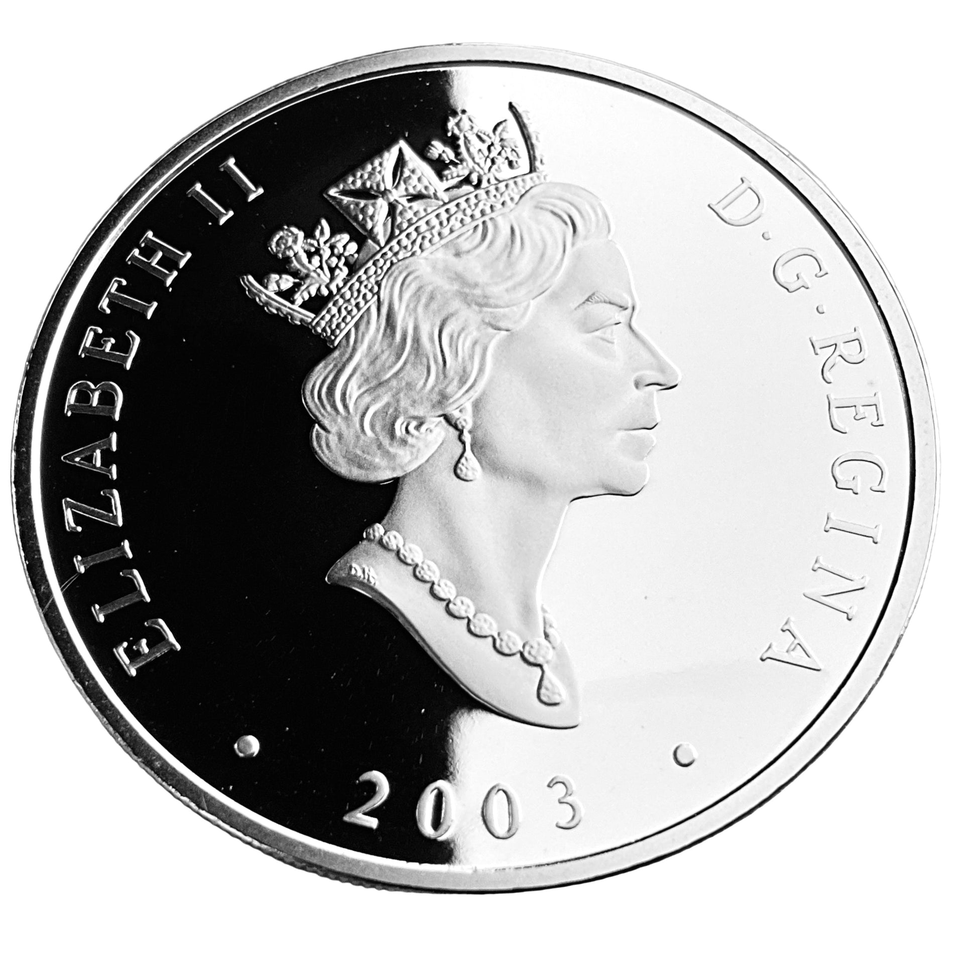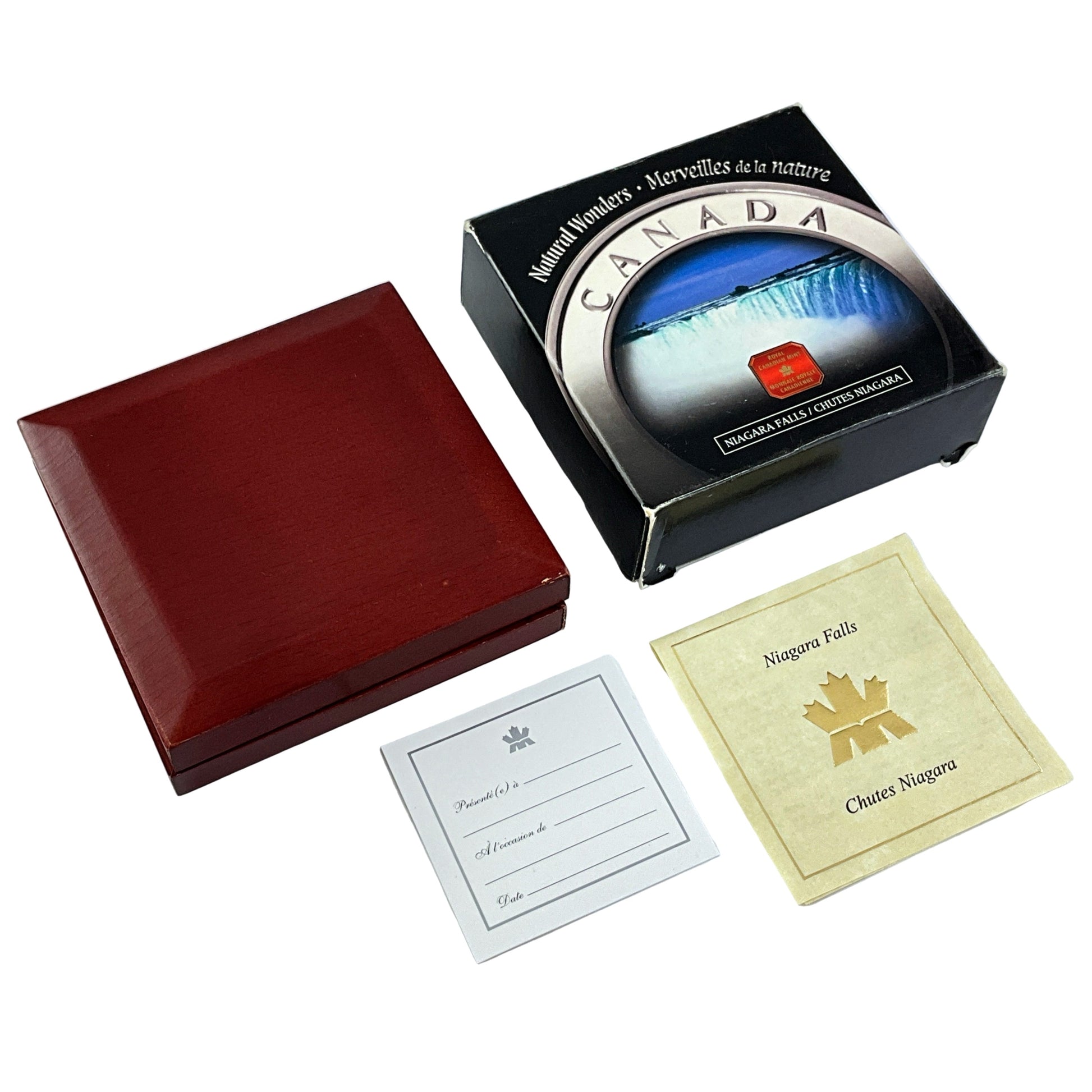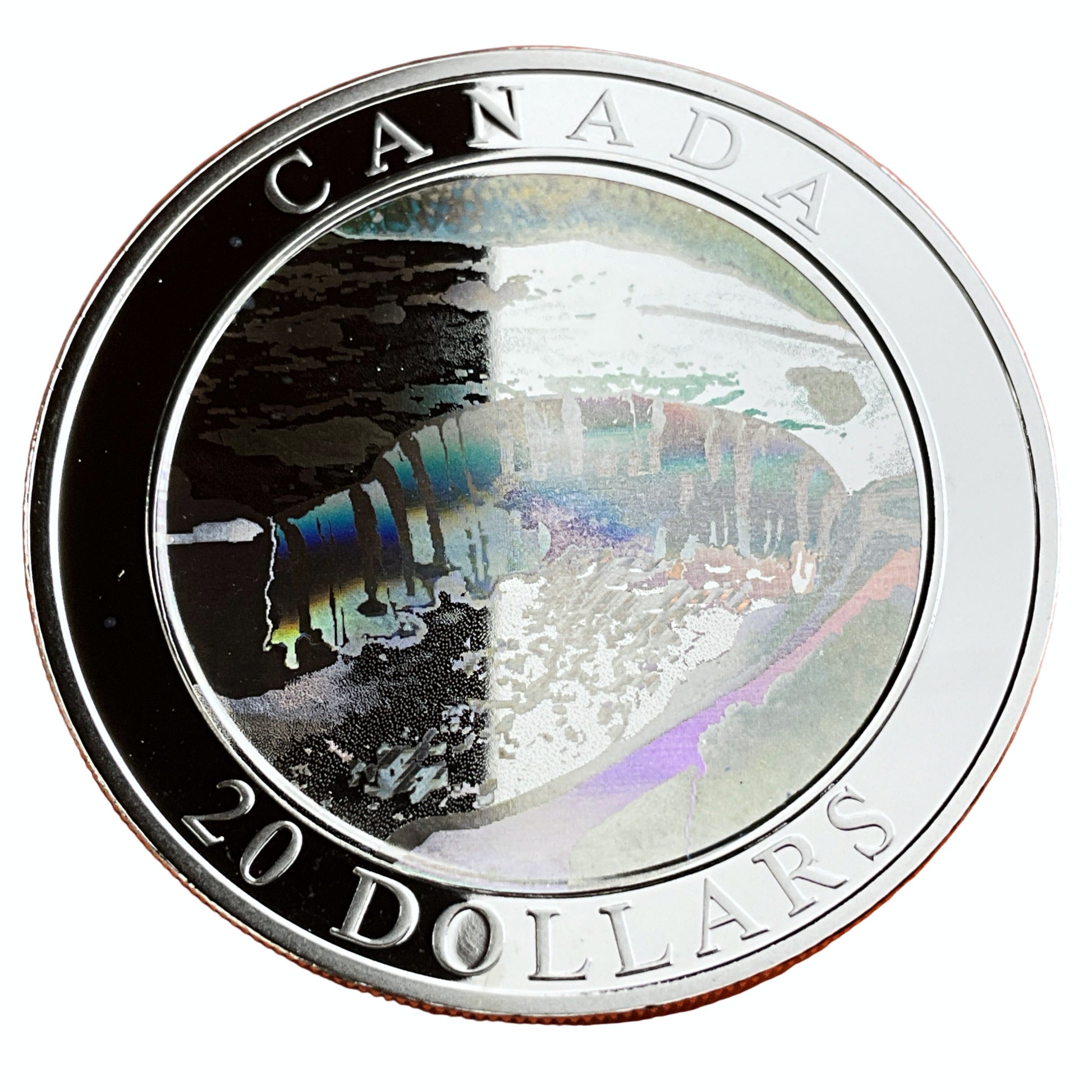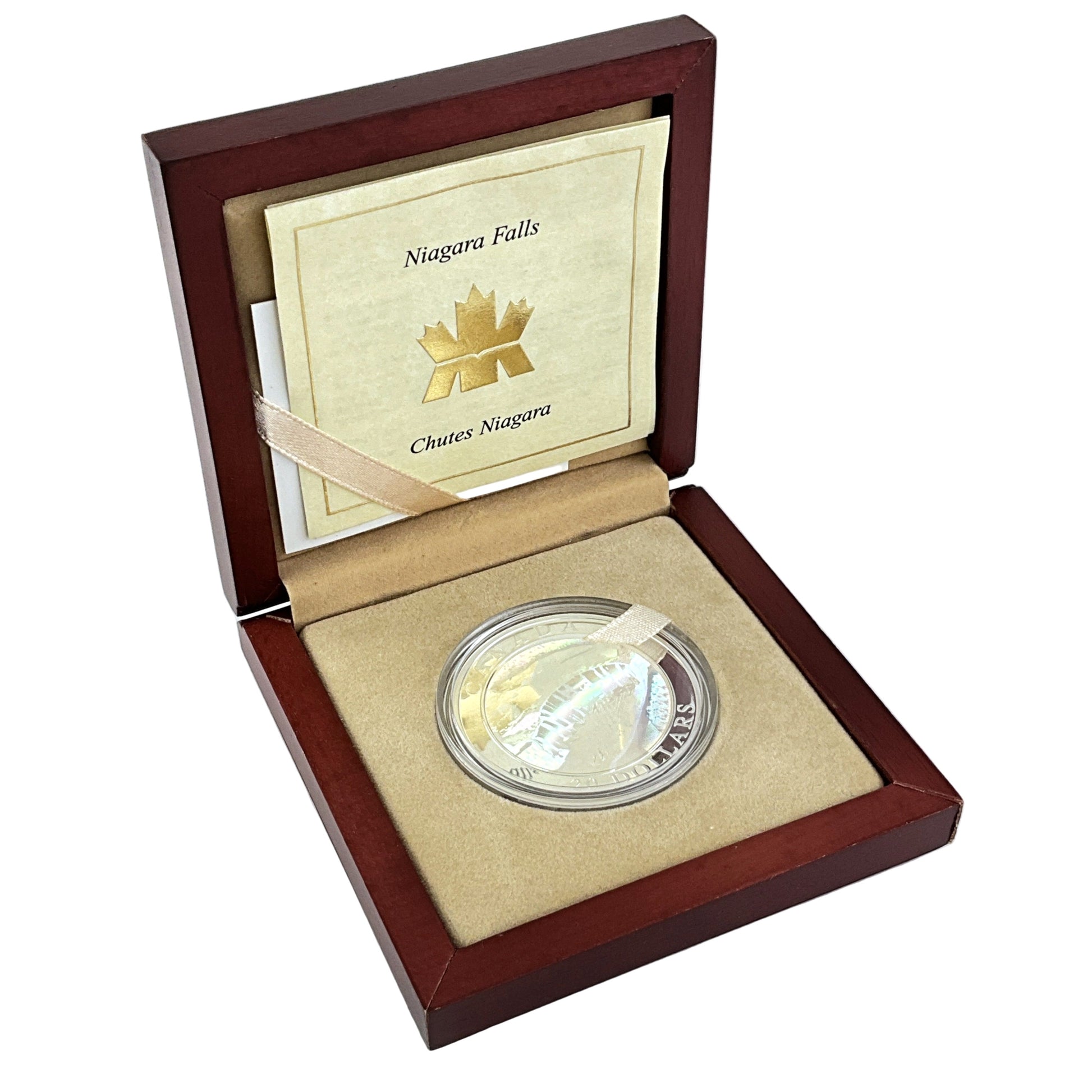 The image displays a 2003 Canadian $20 coin featuring a depiction of Niagara Falls.