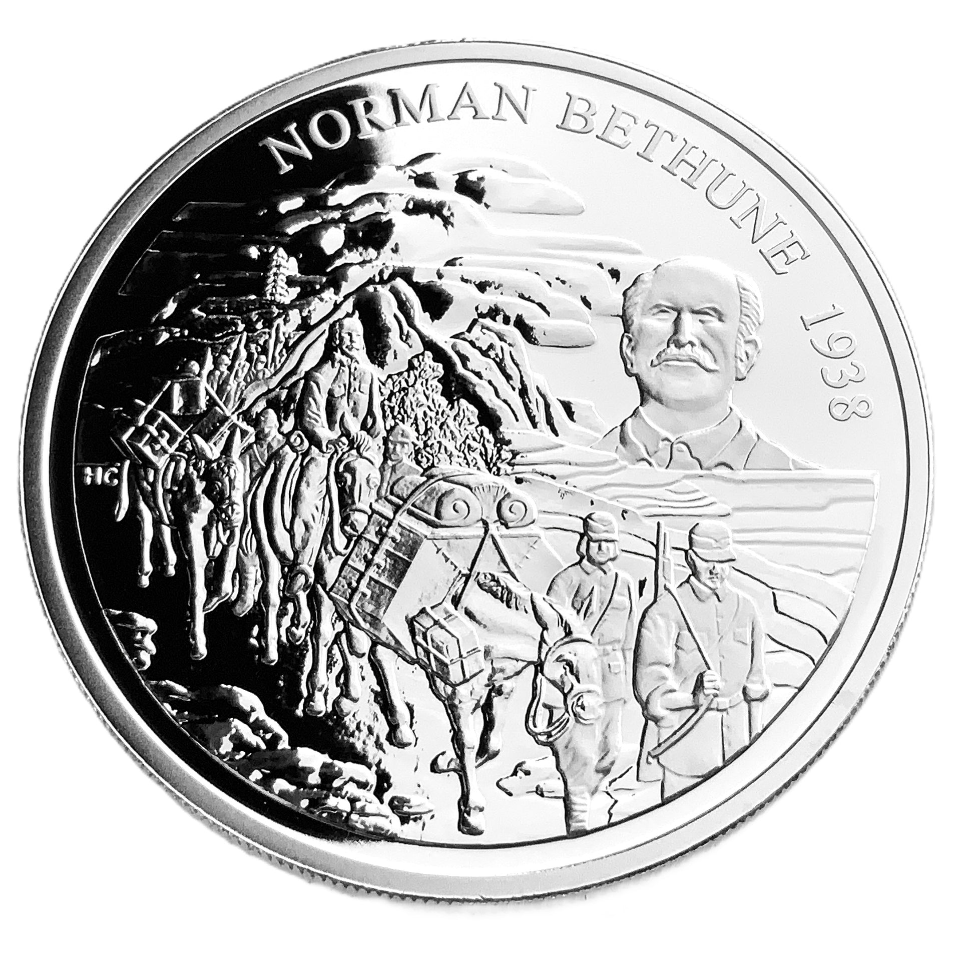 The image provided appears to be a Canadian $5 fine silver coin issued in 1998 to commemorate the 60th anniversary of Dr. Norman Bethune's arrival in China in 1938. The coin depicts a scene from his time in China, where he served as a field surgeon during the Sino-Japanese War.