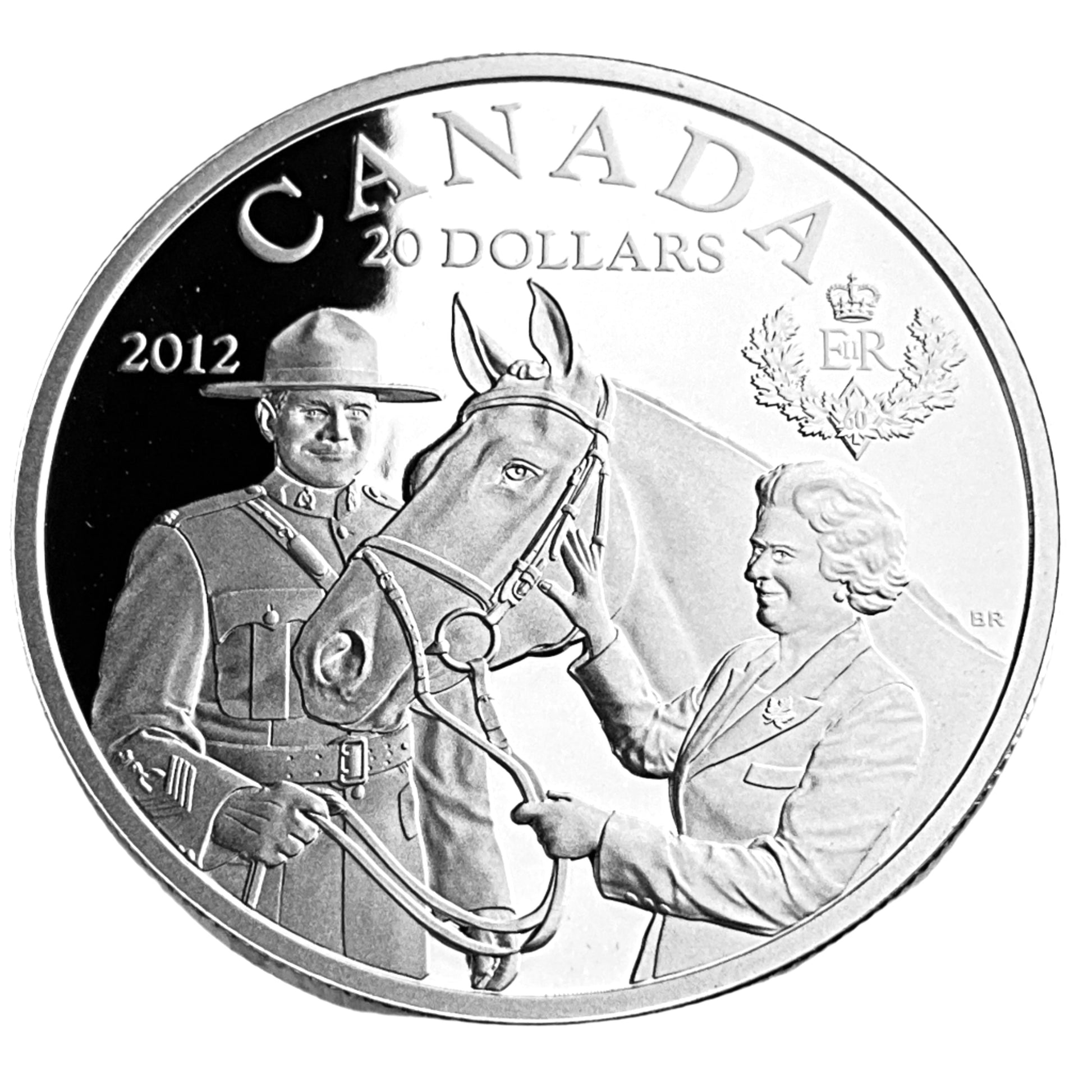 The coin's reverse, designed by Canadian artist Bonnie Ross, depicts a smiling Queen Elizabeth II with her horse, Burmese, and an RCMP Sergeant Major.