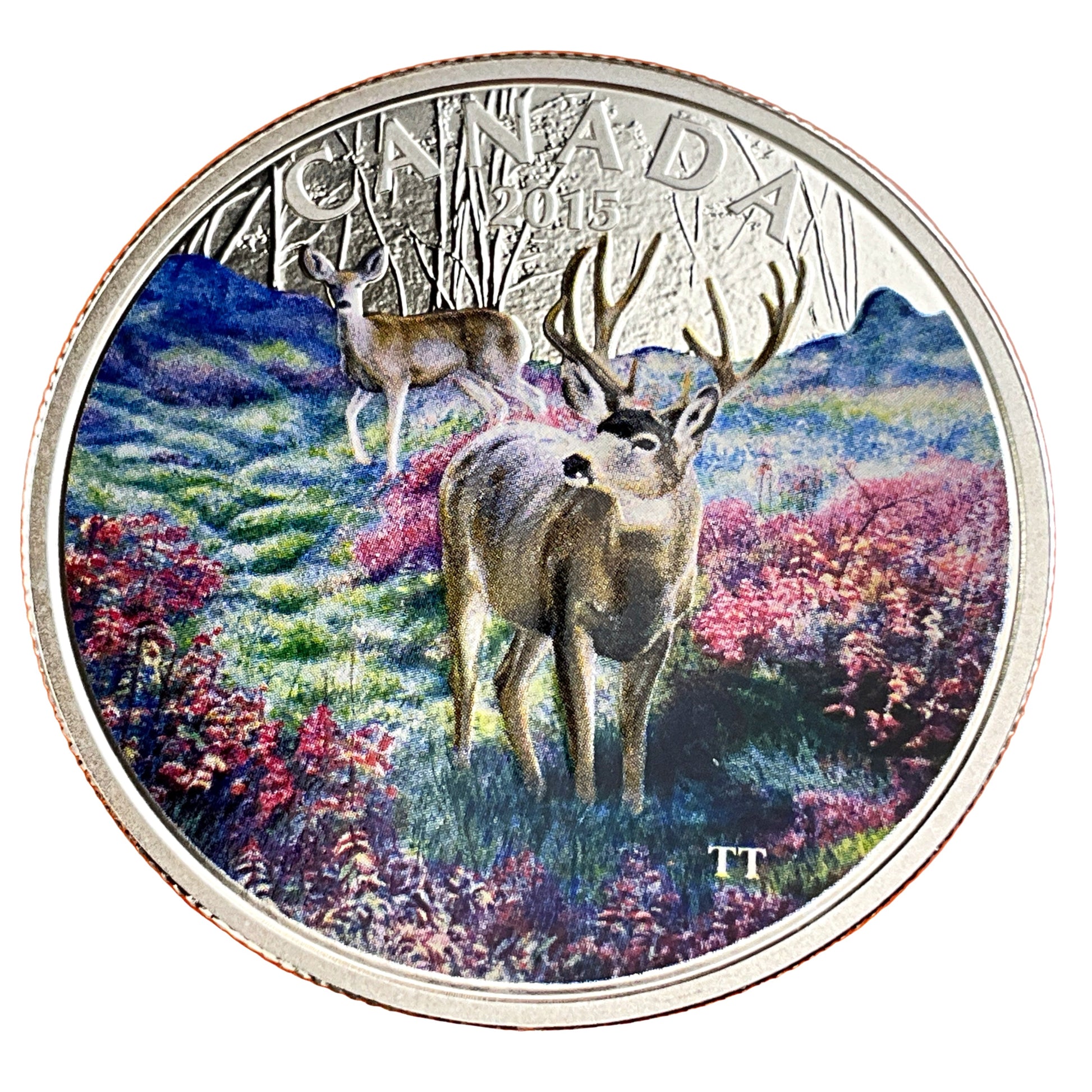 Design: The coin features a coloured image of a male and female mule deer in a forest setting, designed by Canadian artist Trevor Tennant.