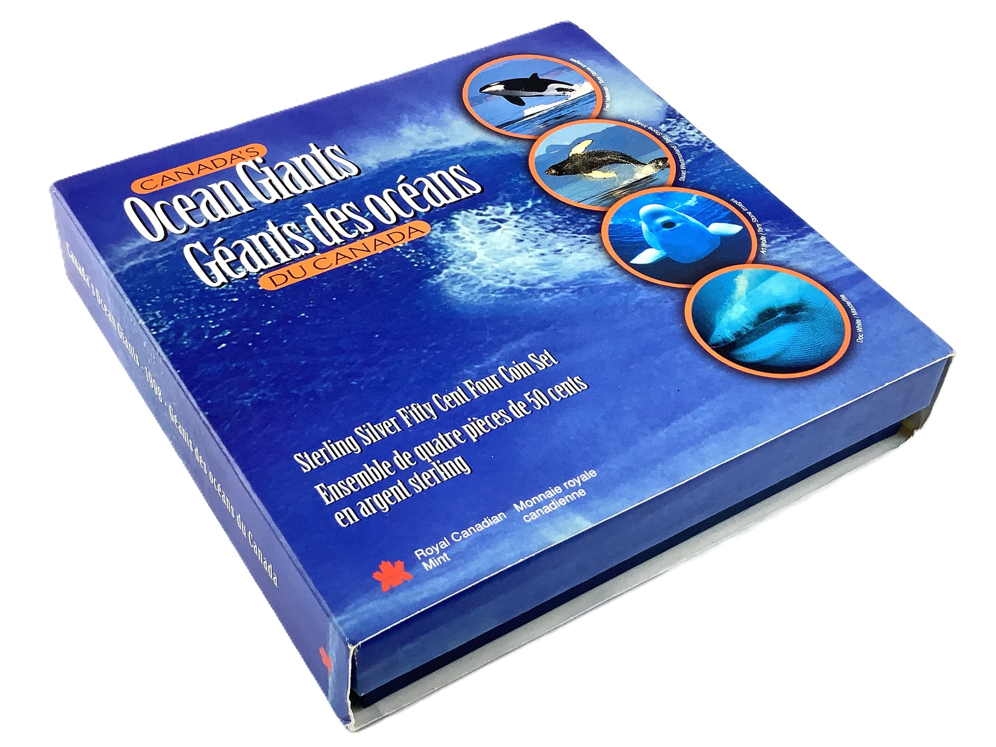 The image displays the 1998 Royal Canadian Mint "Canada's Ocean Giants" four-coin set. This set features four sterling silver 50-cent coins, each depicting a different whale species.