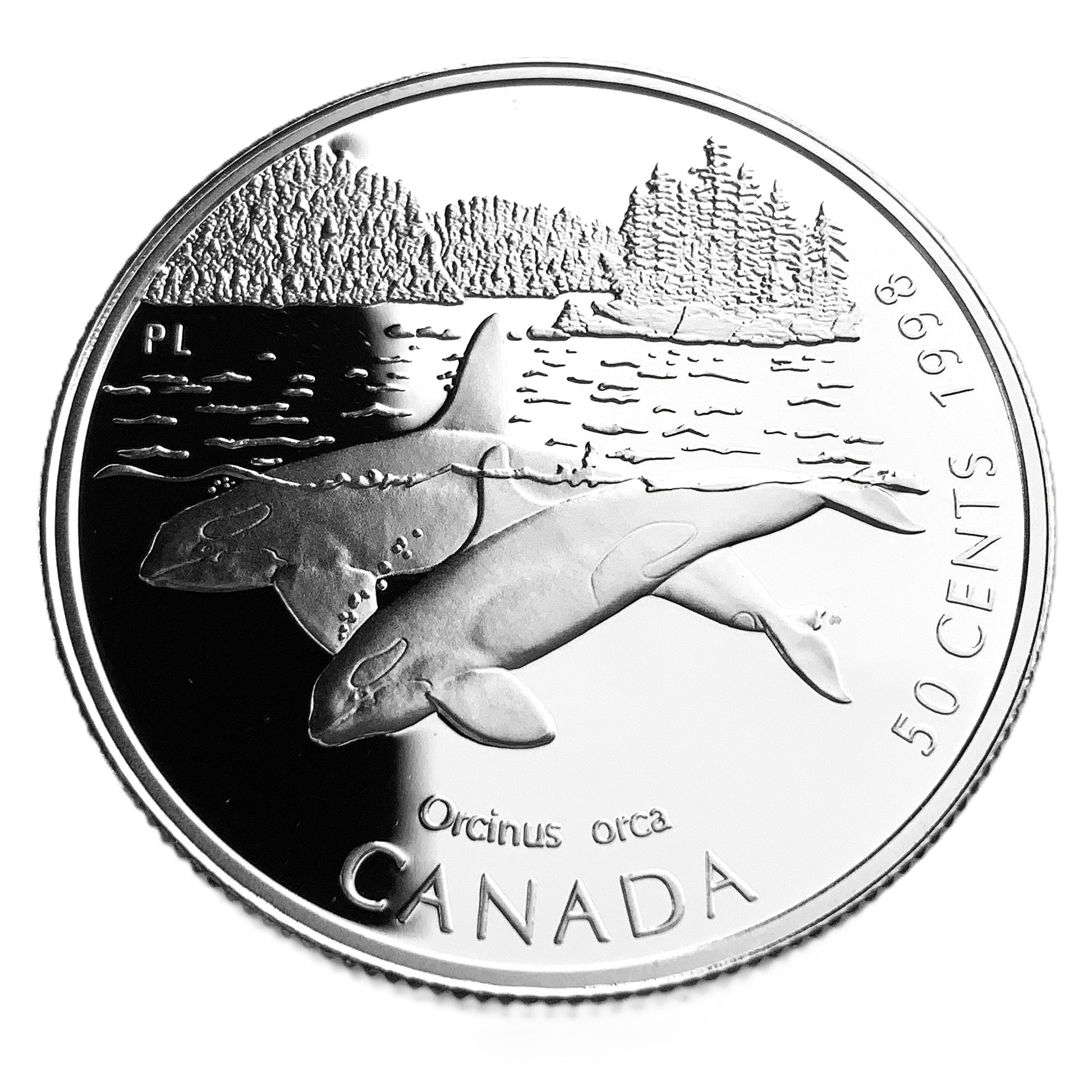 The set includes coins for the Killer Whale, Humpback Whale, Beluga Whale, and Blue Whale.