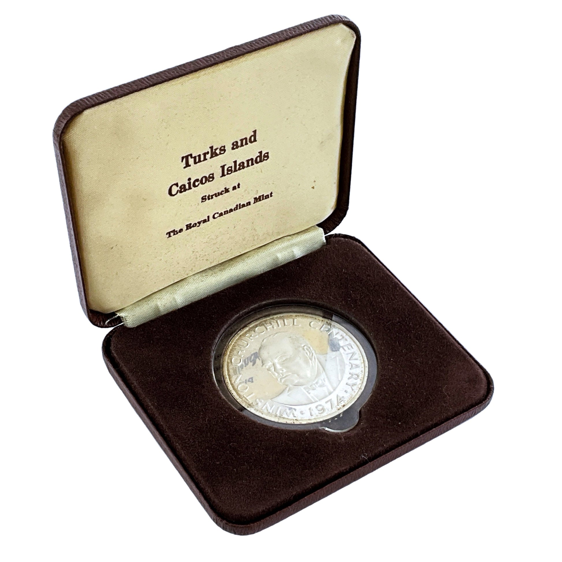 The image shows a 1974 Turks and Caicos Islands 20 Crowns Sterling Silver Coin, commemorating the centenary of Sir Winston Churchill's birth.
