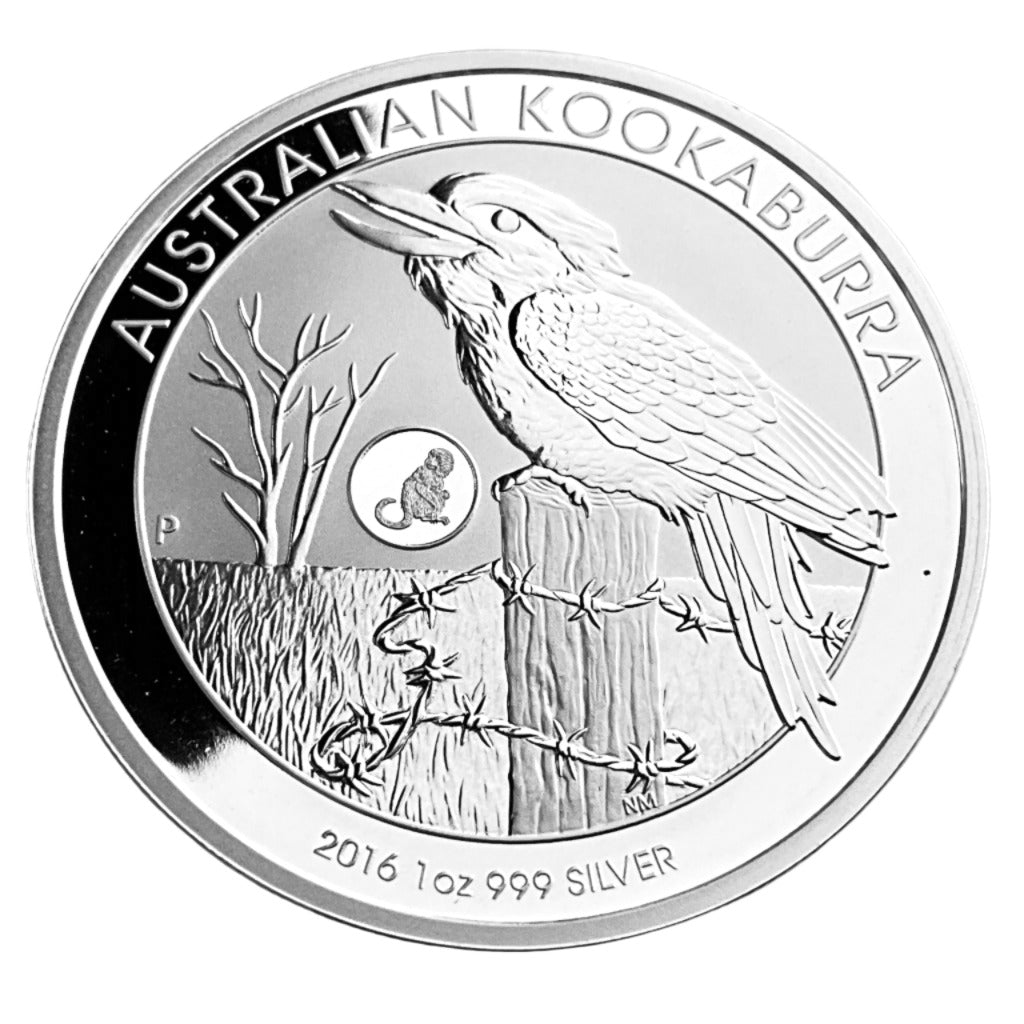 The coin features a kookaburra perched on a fence post, with a small monkey privy mark within a circle to the left of the bird. The inscription "AUSTRALIAN KOOKABURRA" is along the top rim, and "2016 1oz 999 SILVER" is along the edge.