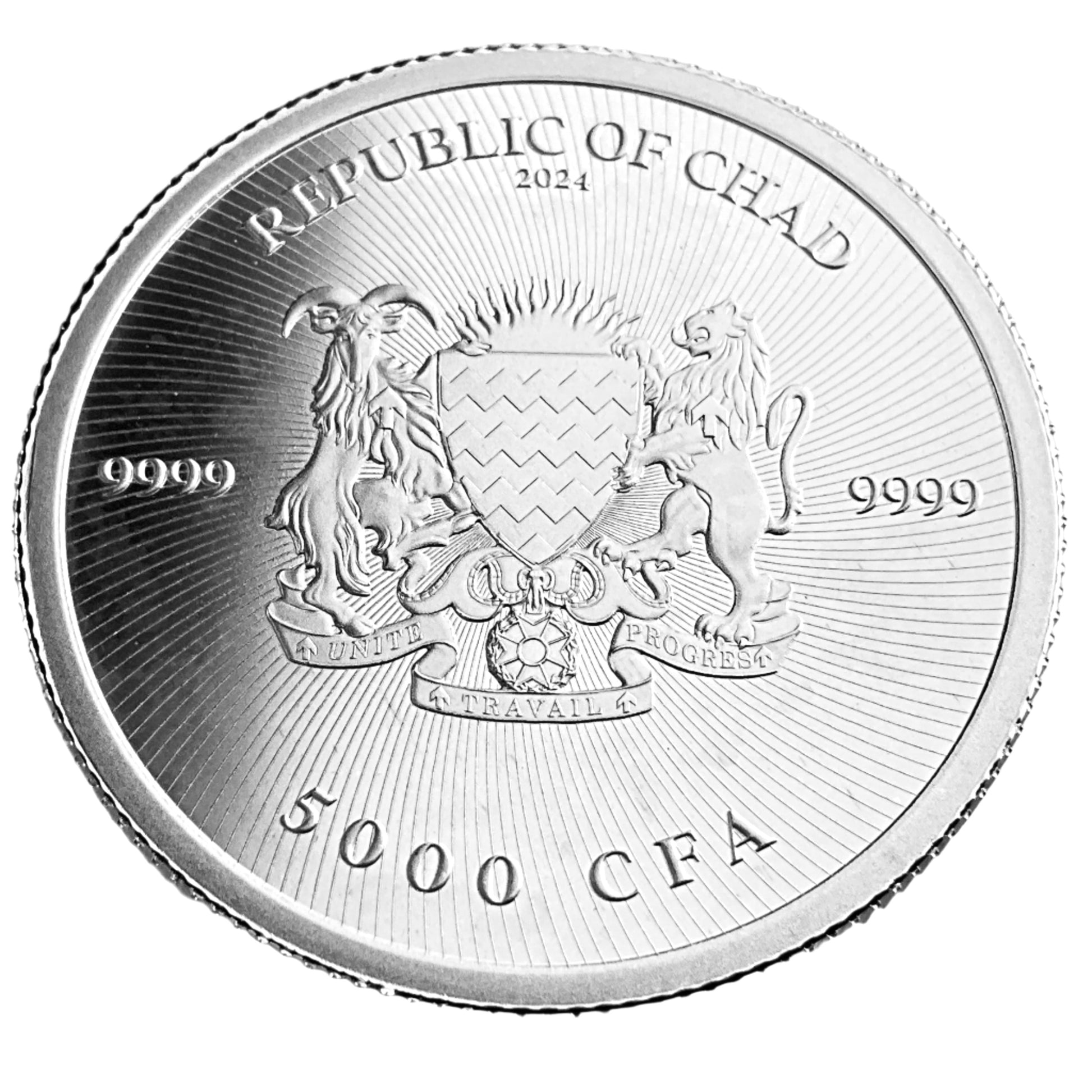 Design: The coin features the national emblem of Chad, which includes a shield supported by a goat and a lion, with the motto "UNITE TRAVAIL PROGRES" (Unity, Work, Progress).