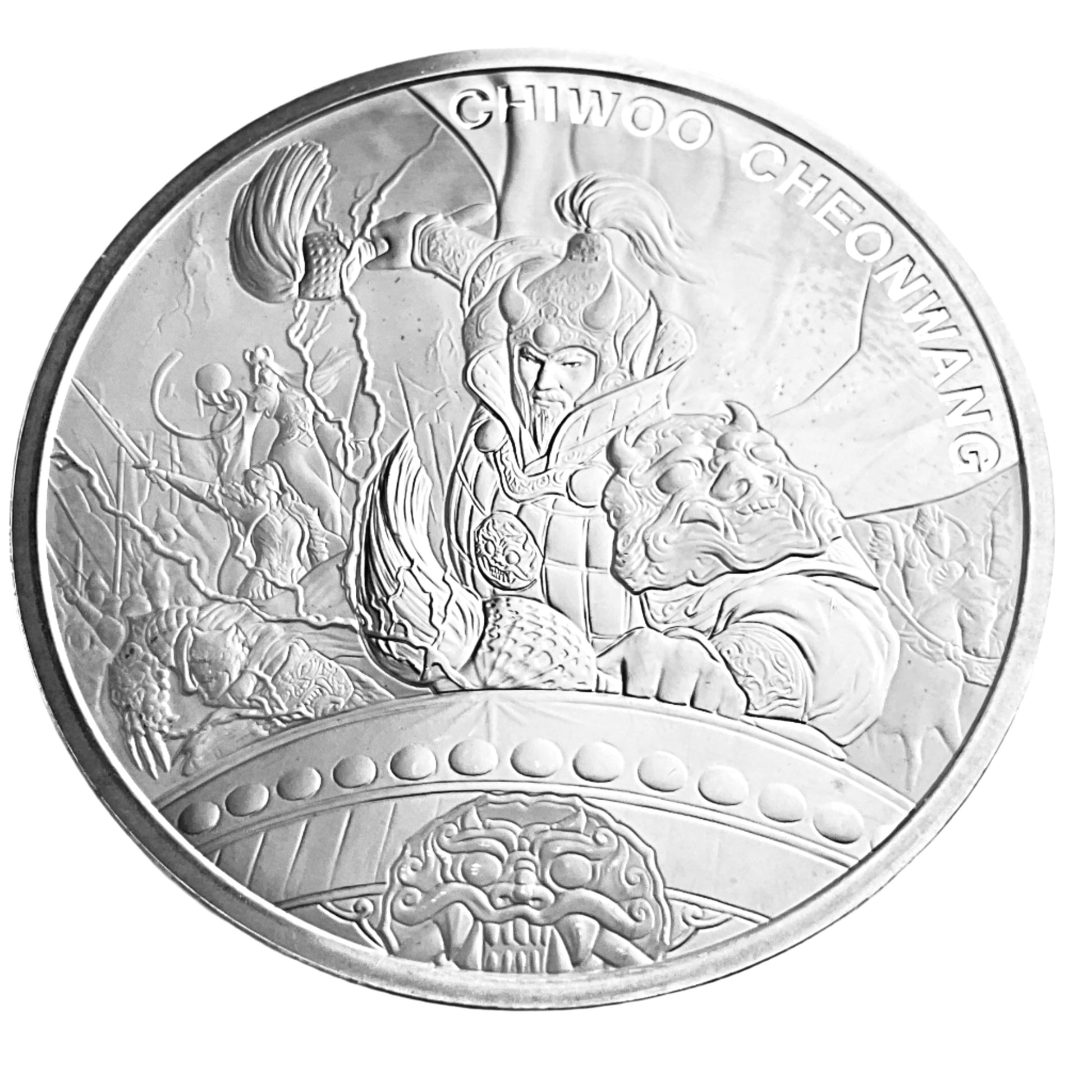 Design: The medal features Chiwoo Cheonwang, a legendary warrior and figure from Korean mythology, often referred to as the God of War. On the reverse side, Chiwoo is depicted in battle armor, beating a war drum with lightning bolts, and accompanied by soldiers or the Zi:Sin (12 Guardians). The obverse side features a shield with the image of Do ggae bi, a Korean mythical figure believed to ward off evil spirits.