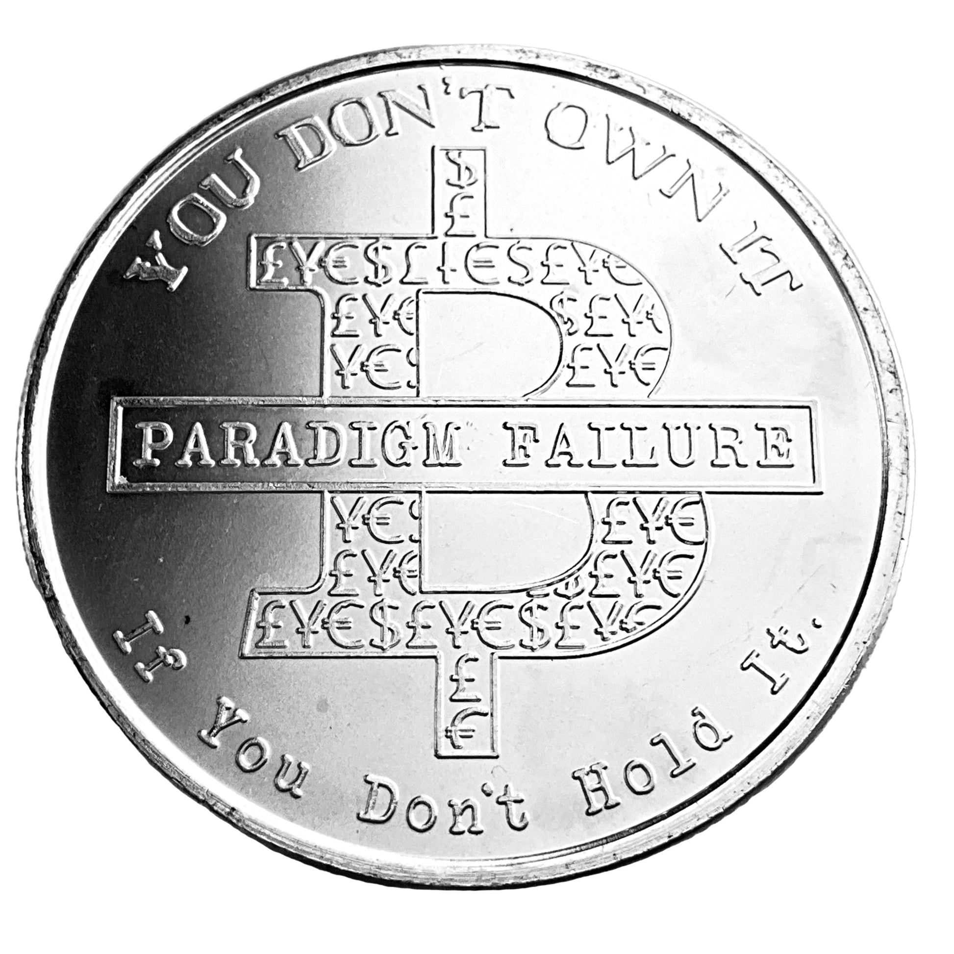 The image displays a commemorative coin featuring a stylized Bitcoin logo and the phrase "PARADIGM FAILURE".
