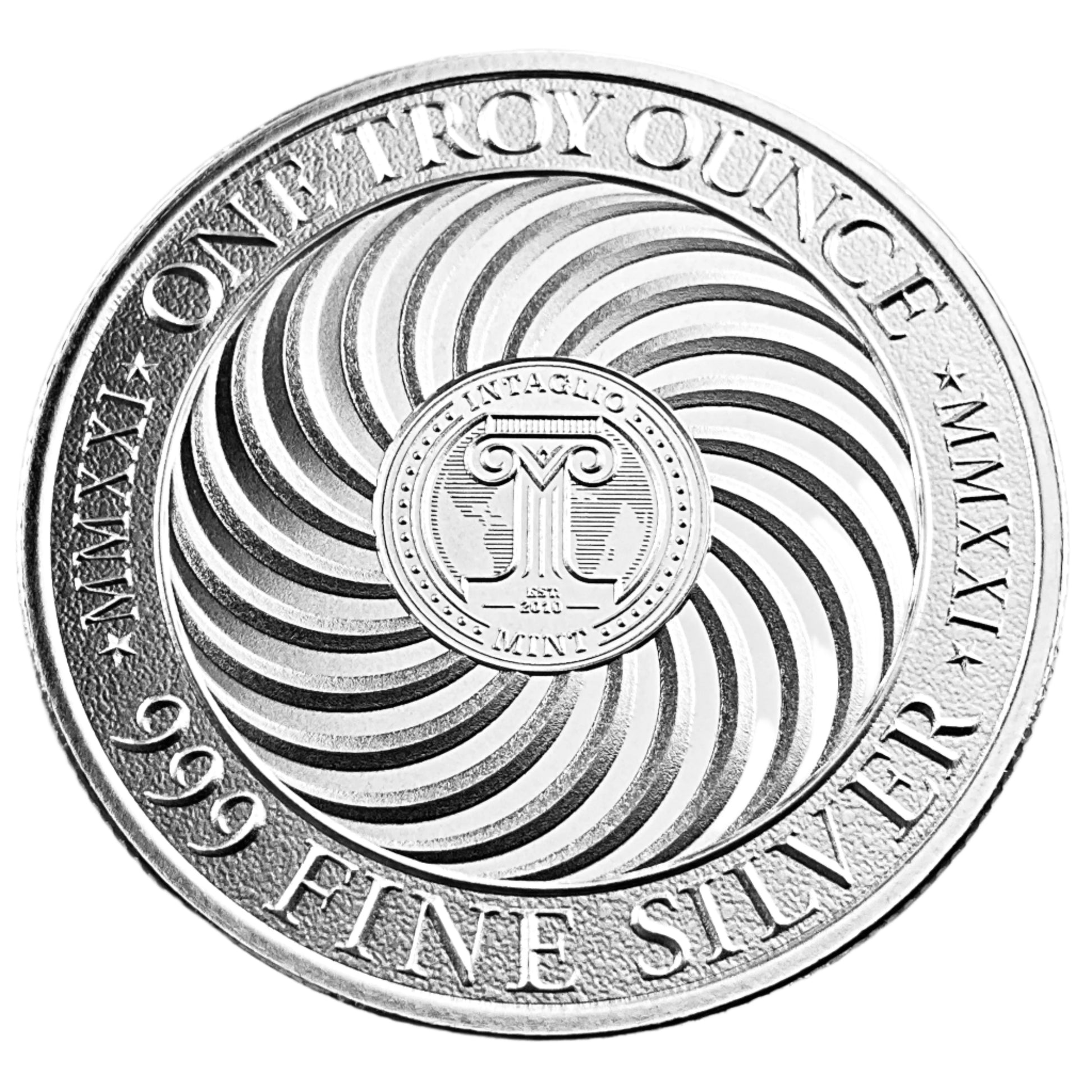 This silver round features a skull wearing a military helmet and holding two pistols, with skeletal hands. "Dulce periculum" is a Latin phrase meaning "danger is sweet".