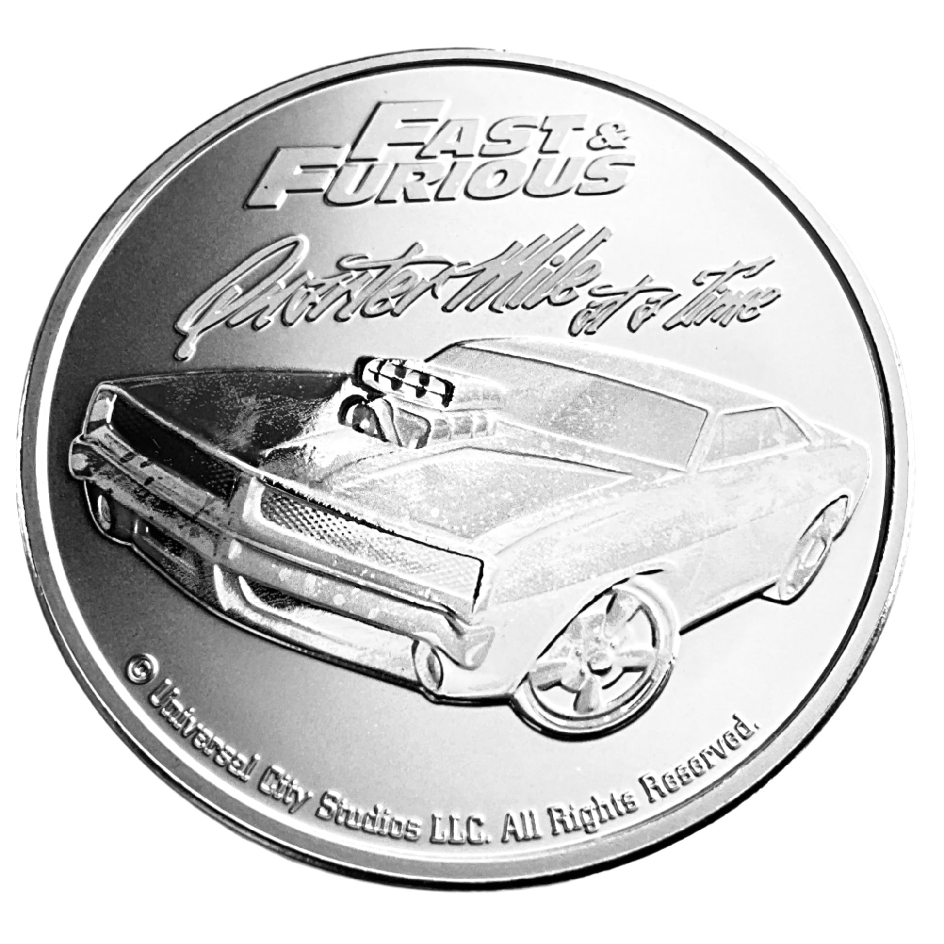 This coin features Dominic Toretto's iconic 1970 Dodge Charger R/T from the Fast & Furious franchise.