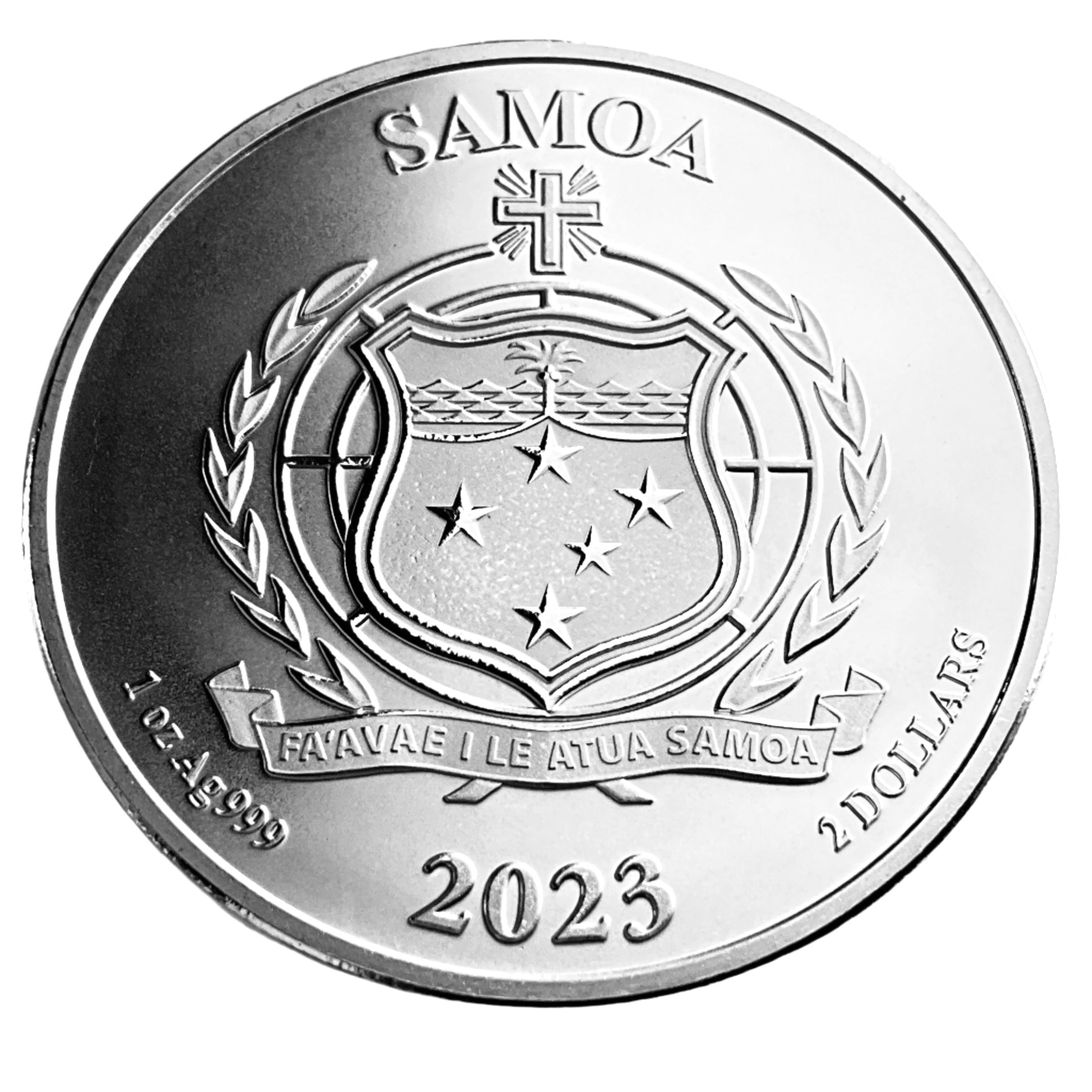 Design: The obverse shows the Public Seal of Samoa, along with the inscriptions of the issuing country, face value, weight, fineness, and year of issue. The coat of arms itself is modeled after the United Nations shield and represents Samoa's unique geographical location.