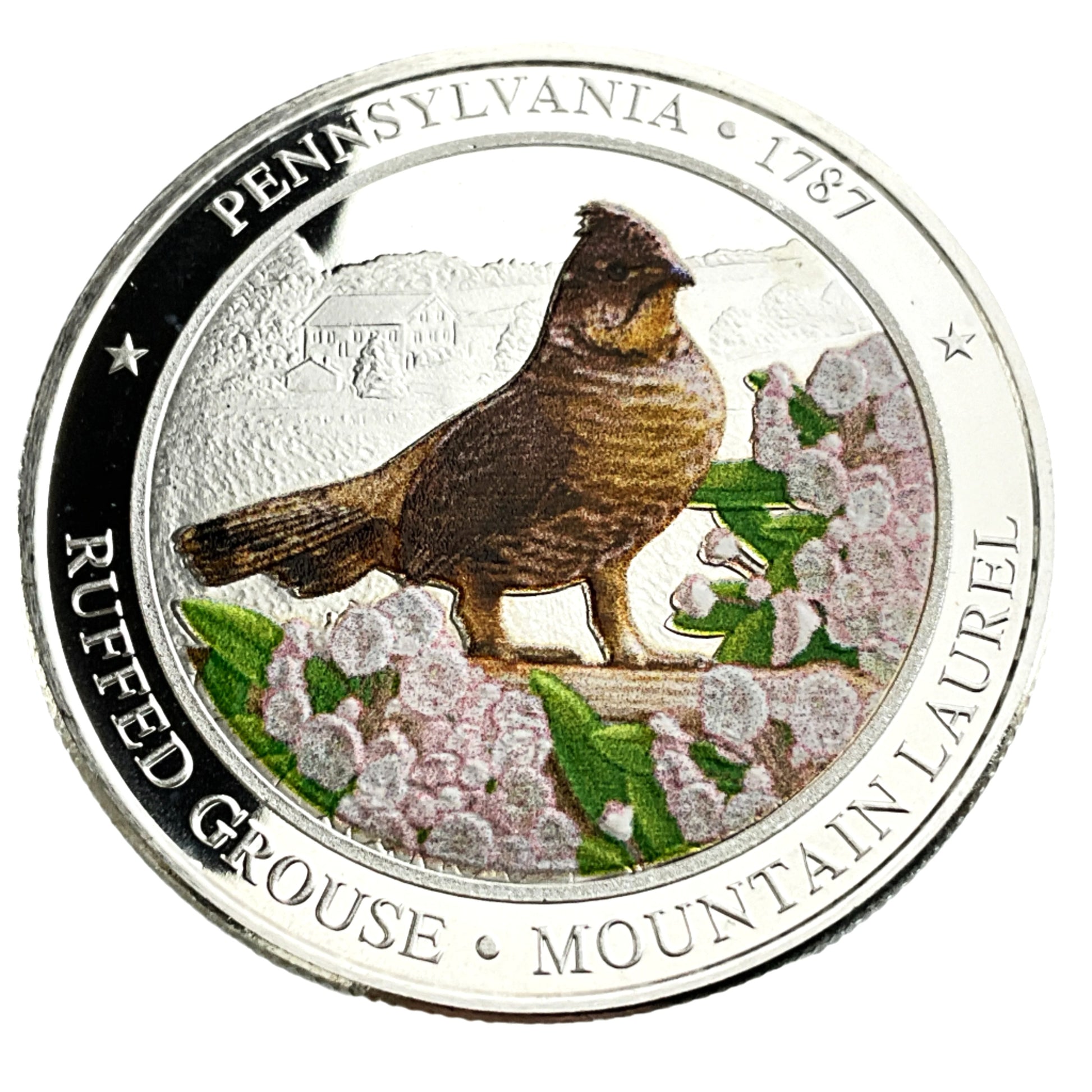Ruffed Grouse: The state bird of Pennsylvania, prominently depicted in the center of the silver round.