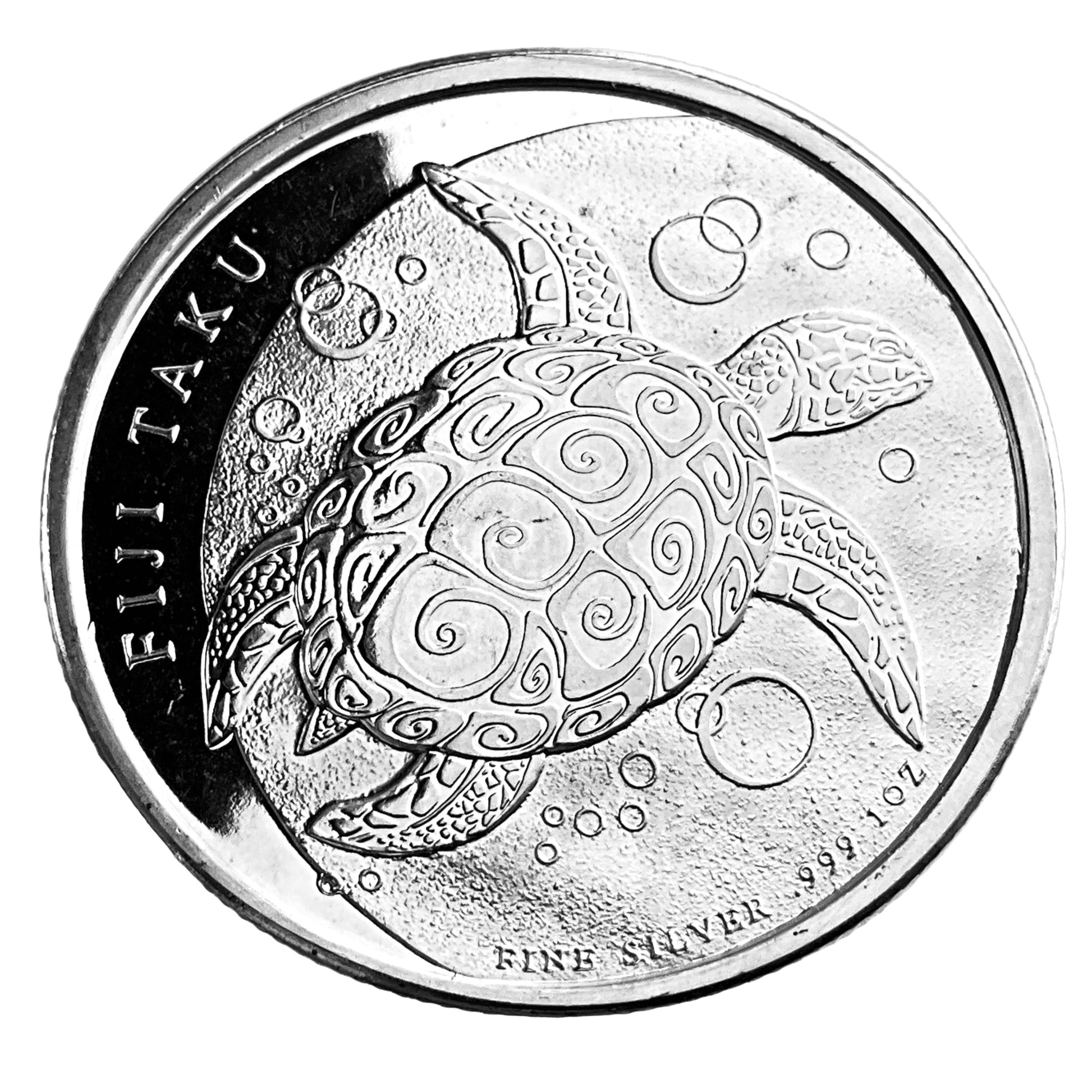 Design: The reverse side of the coin, shown in the image, features a Hawksbill turtle swimming amidst bubbles, with the inscription "FIJI TAKU" and "FINE SILVER .999 1OZ" indicating its origin and silver purity/weight.