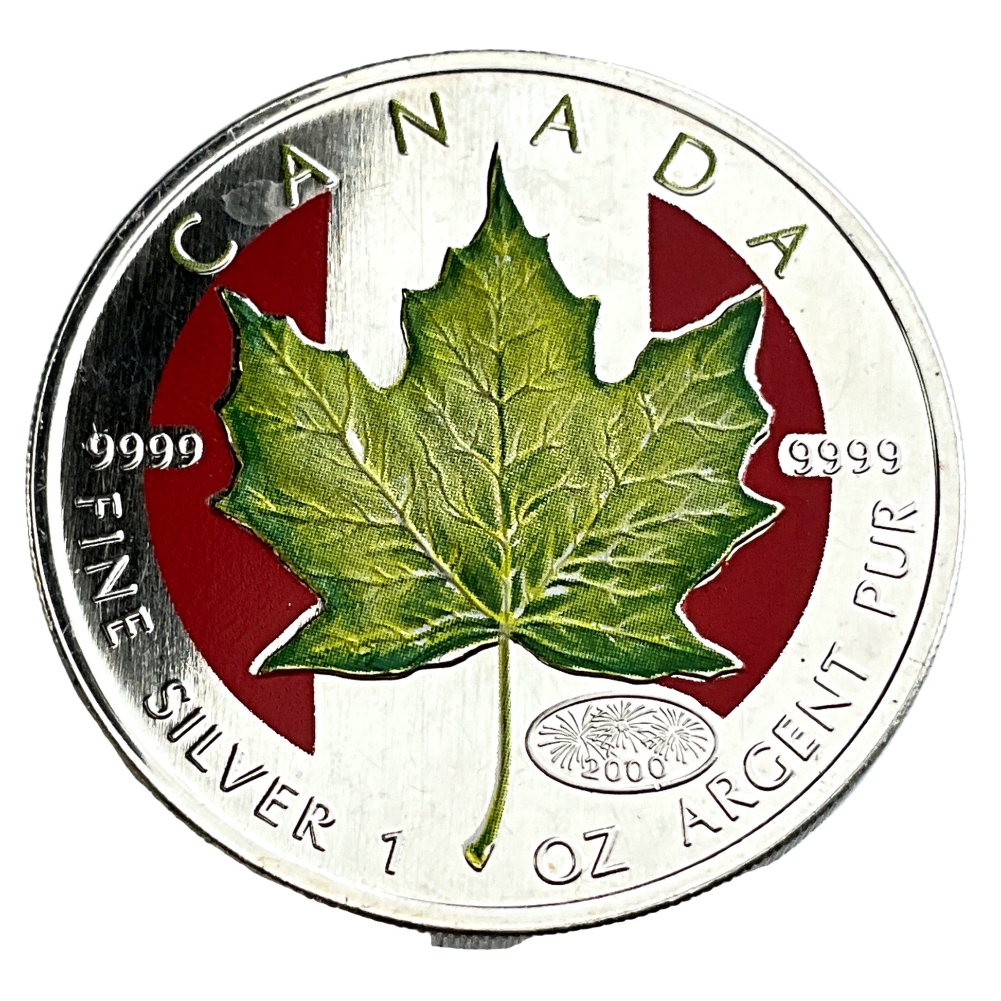 The image displays a 1999 Canadian Silver Maple Leaf coin with a colored maple leaf design.