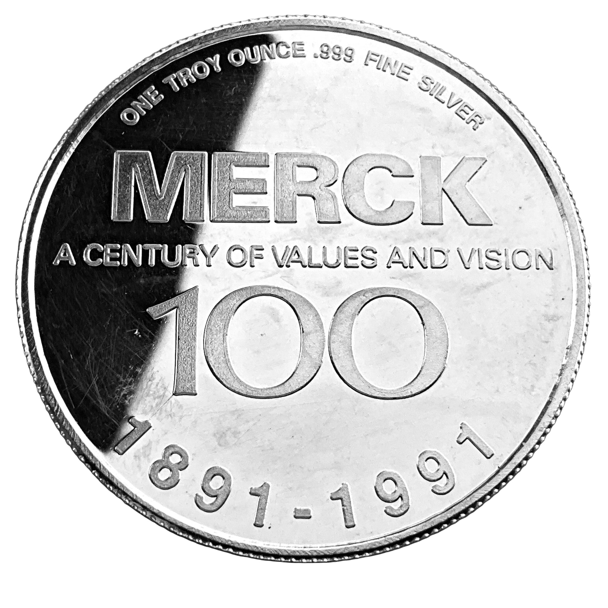 The image shows a 1991 Merck & Co. Pharmaceuticals 1 Troy Oz. .999 Fine Silver Round, issued to commemorate the company's 100th anniversary (1891-1991).