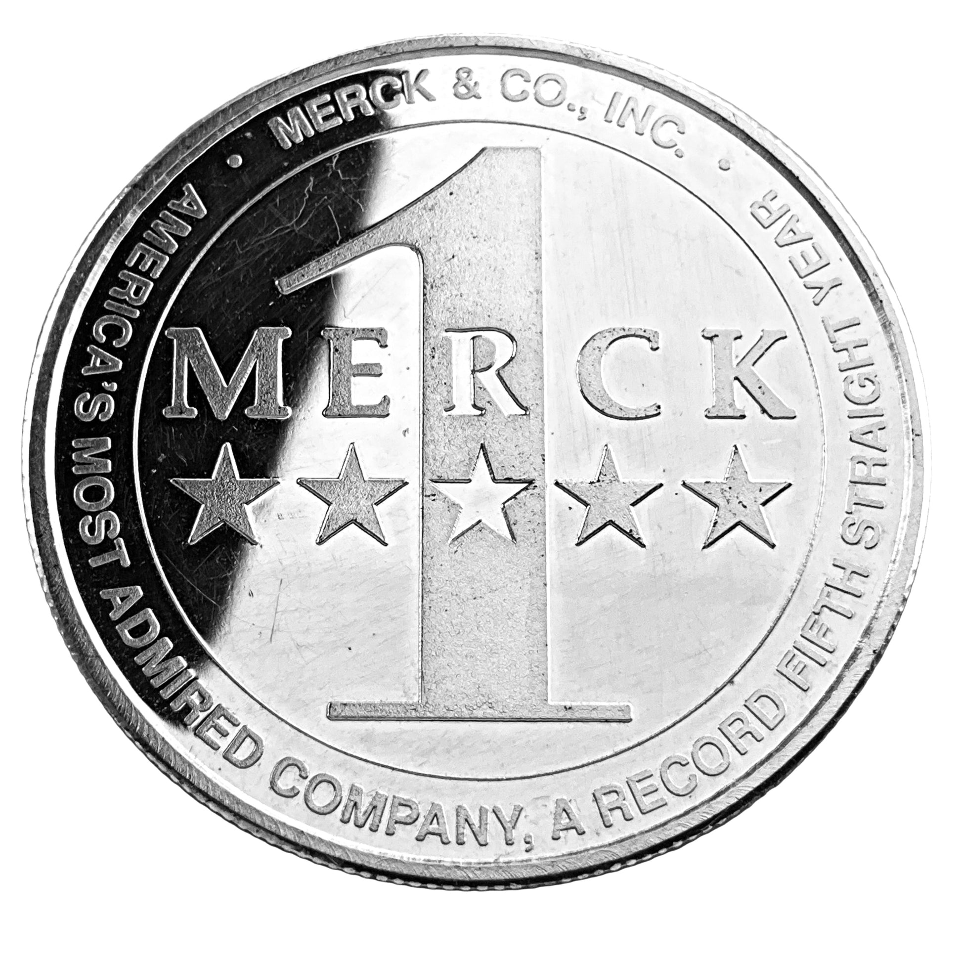 The coin's design features a large "1" and the company name "MERCK," along with five stars and the text "AMERICA'S MOST ADMIRED COMPANY, A RECORD FIFTH STRAIGHT YEAR".
