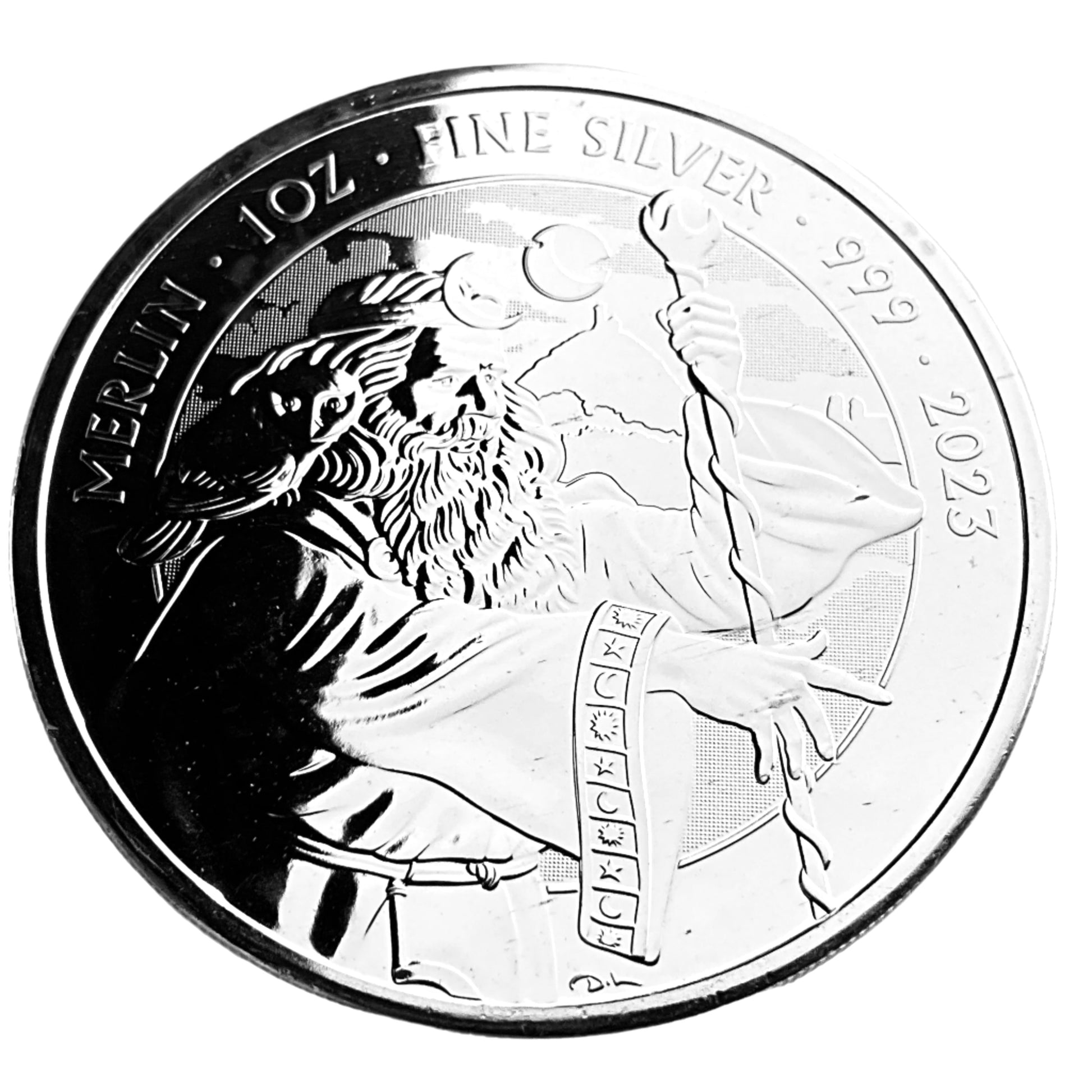 The image shows a 2023 1 oz British Silver Merlin Coin from The Royal Mint's Myths and Legends series.