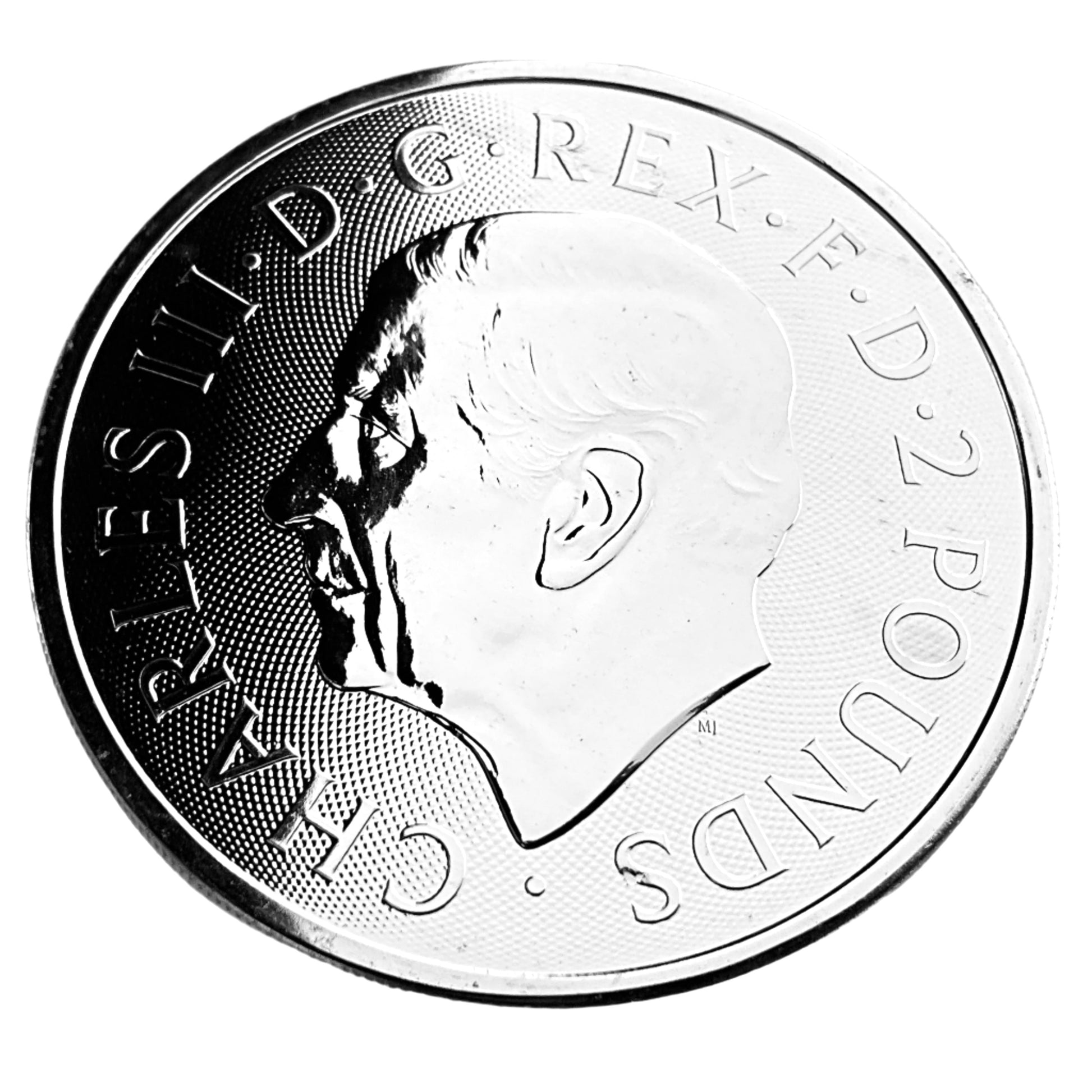 Monarch: The obverse features a portrait of King Charles III, along with the inscription "CHARLES III D. G. REX F. D. 2 POUNDS".