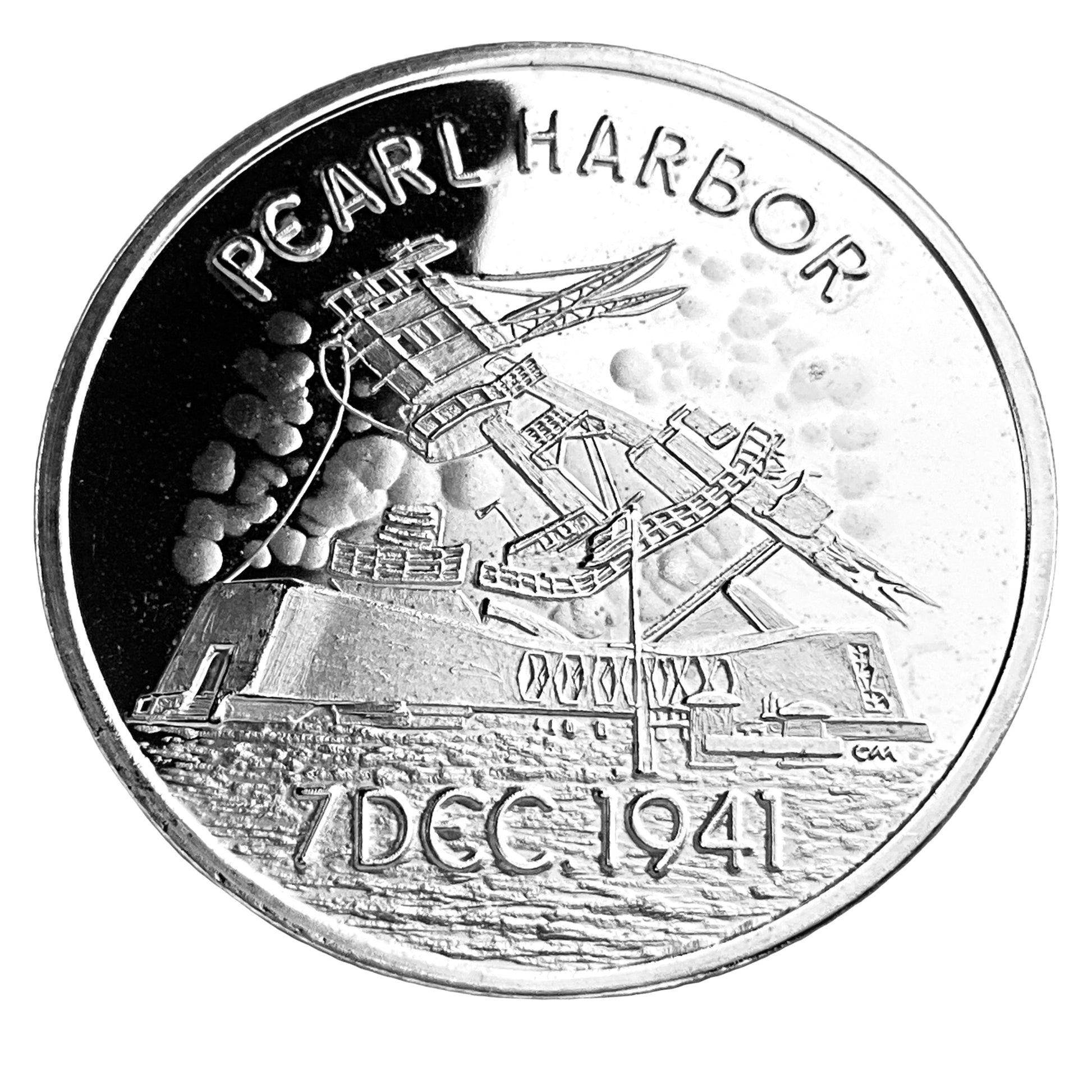 This image displays a commemorative coin or medal depicting the attack on Pearl Harbor on December 7, 1941.