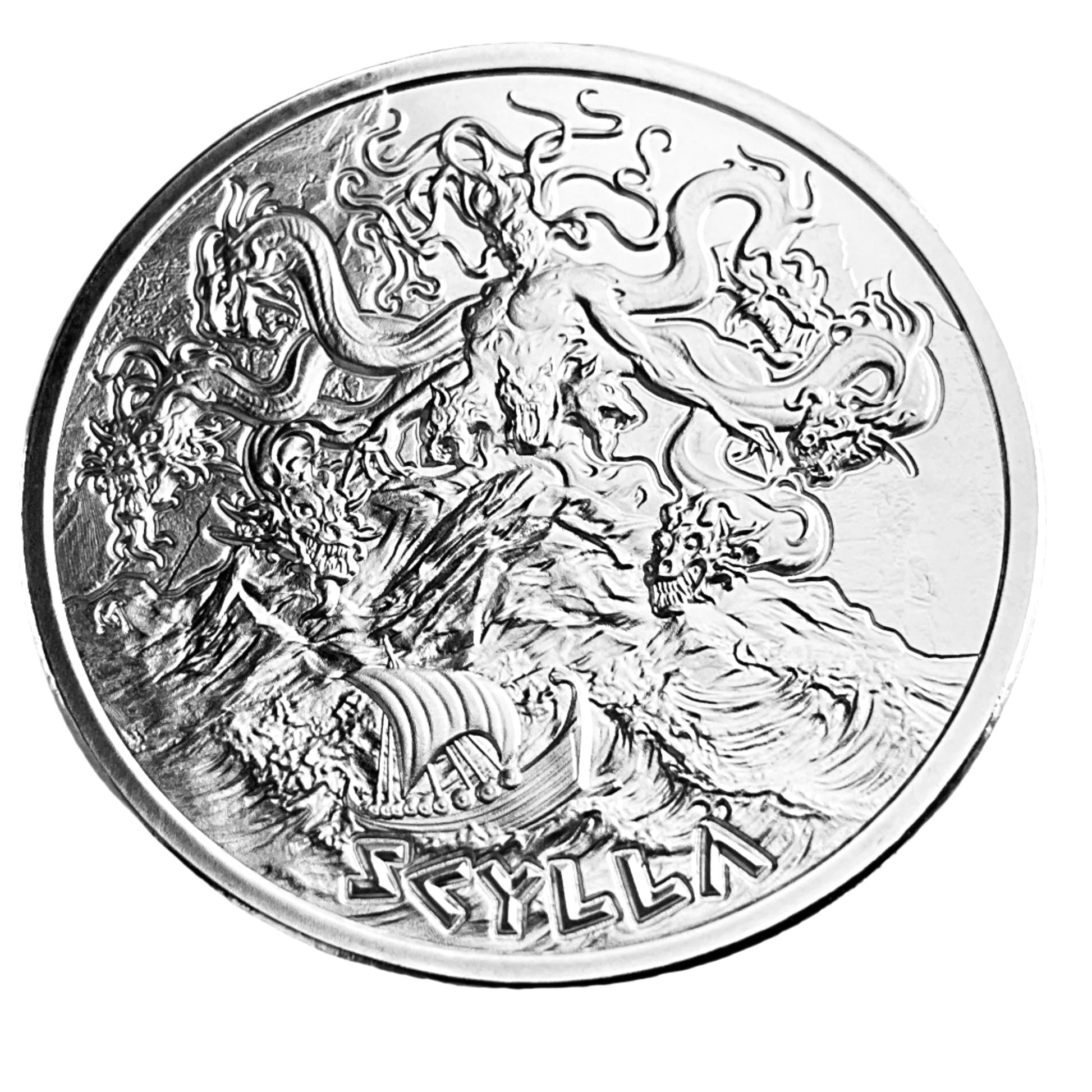 The round features a high-relief design, showcasing Scylla's terrifying visage, and is struck from 1 ounces of .999 fine silver.