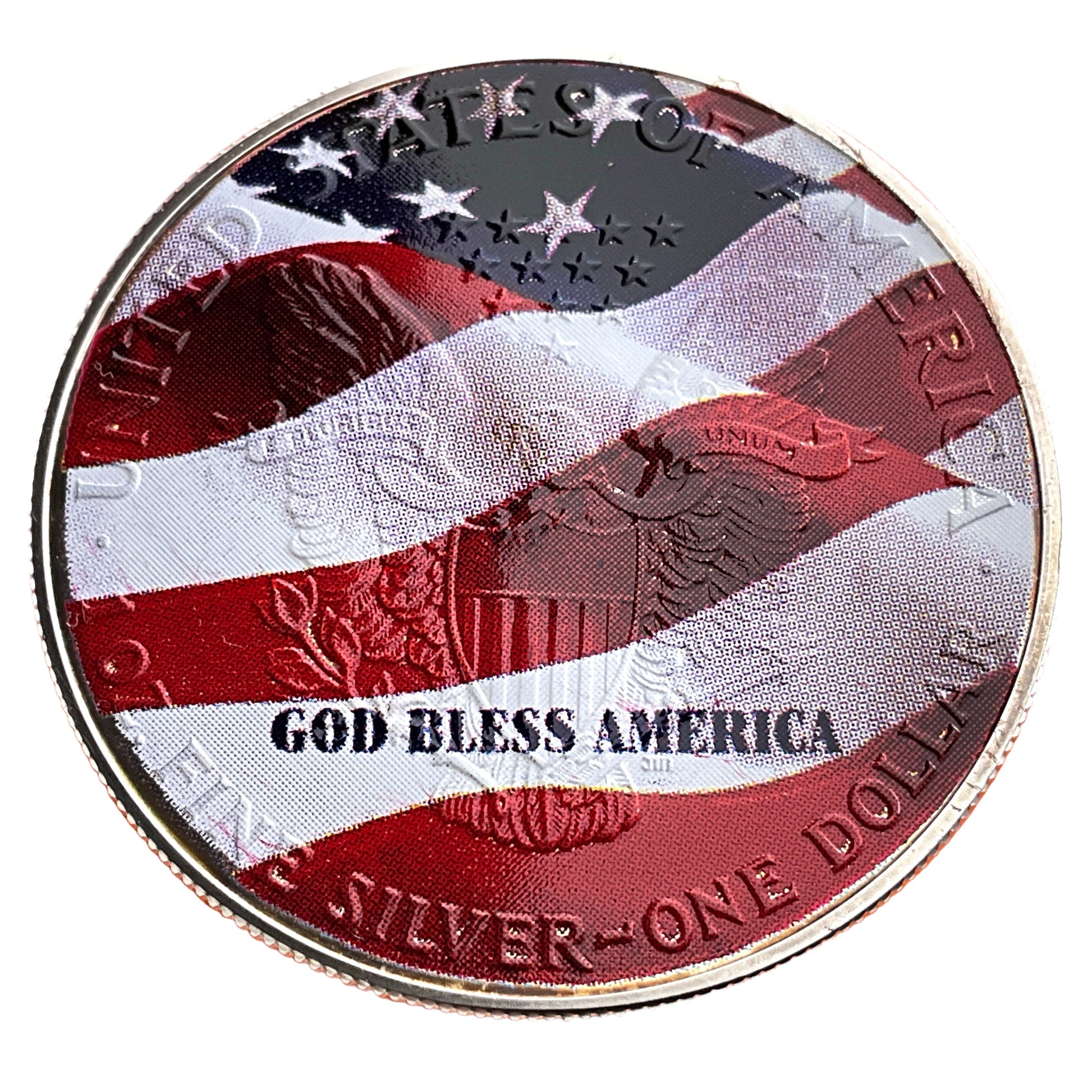 The image shows a colorized 2001 American Silver Eagle coin commemorating the September 11th attacks.