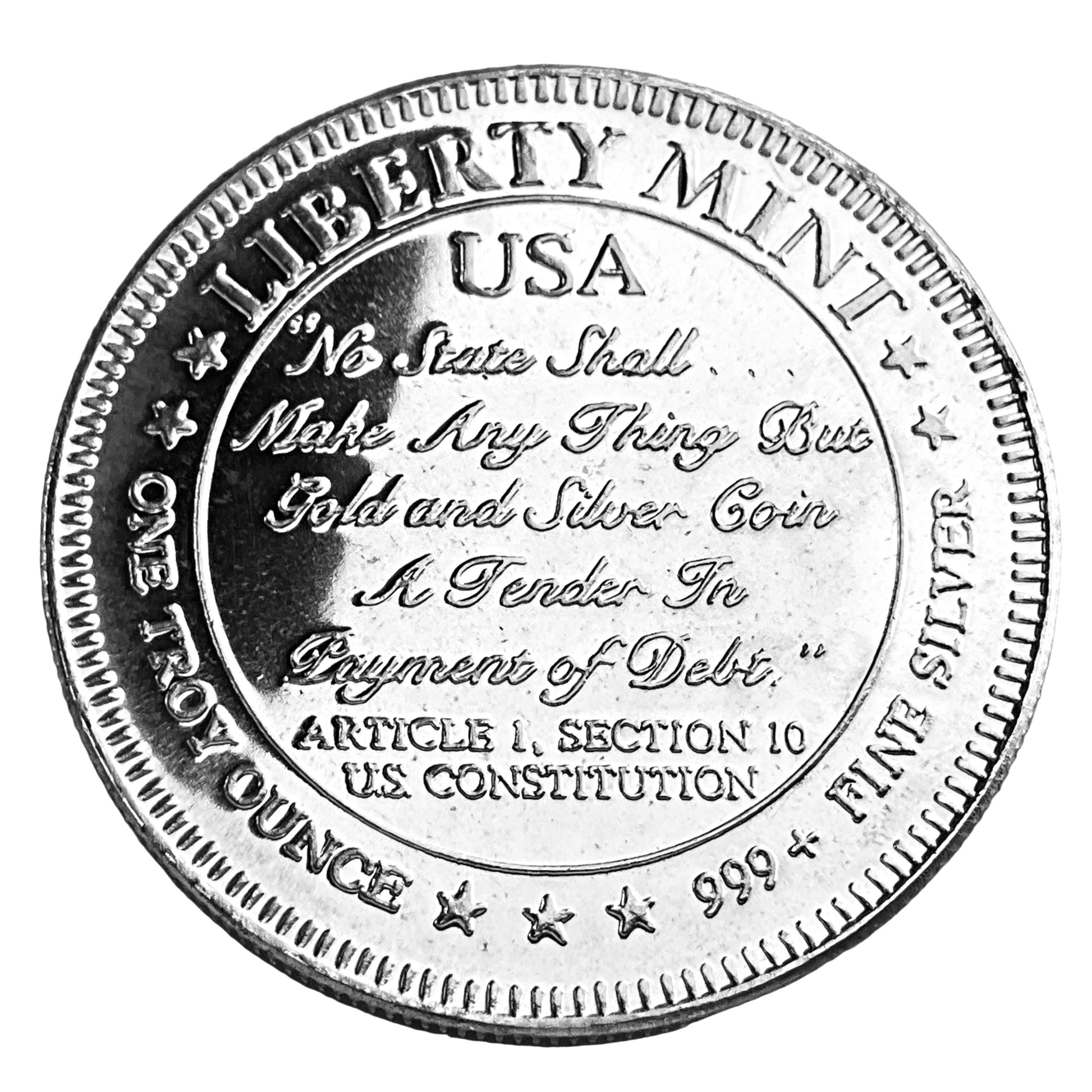 The image displays a silver round from the "Liberty Mint". This round features text referencing Article 1, Section 10 of the U.S. Constitution, specifically the clause stating, "No State shall... make Any Thing but Gold and Silver Coin a Tender in Payment of Debts".