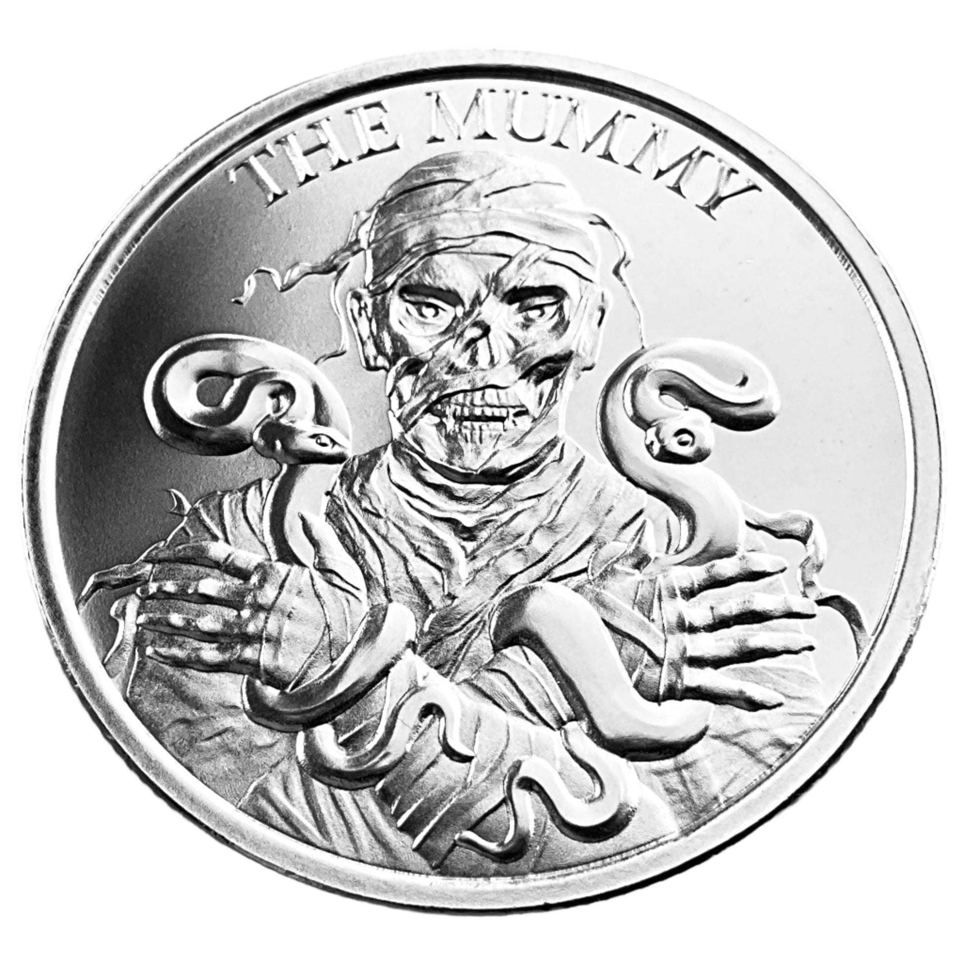 The image shows a silver round featuring "The Mummy" from the Vintage Horror Series.