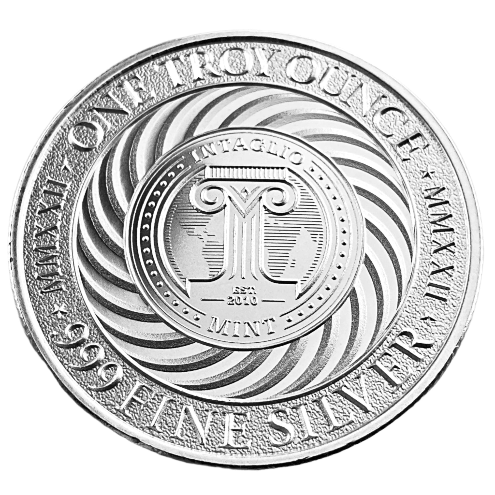 The obverse depicts a mummy with snakes, while the reverse features the Intaglio Mint logo along with the weight and purity.