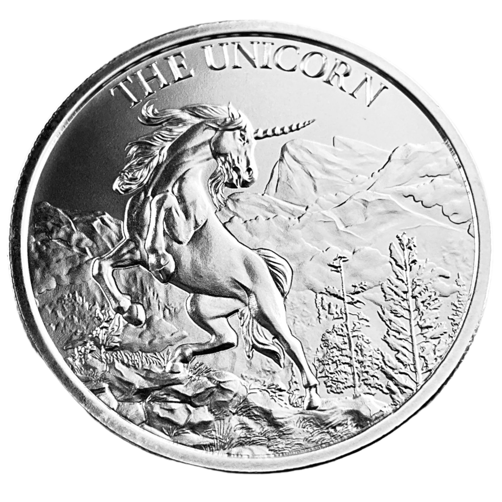 The obverse depicts a powerful unicorn, standing on its hind legs in a mountainous, forested landscape.