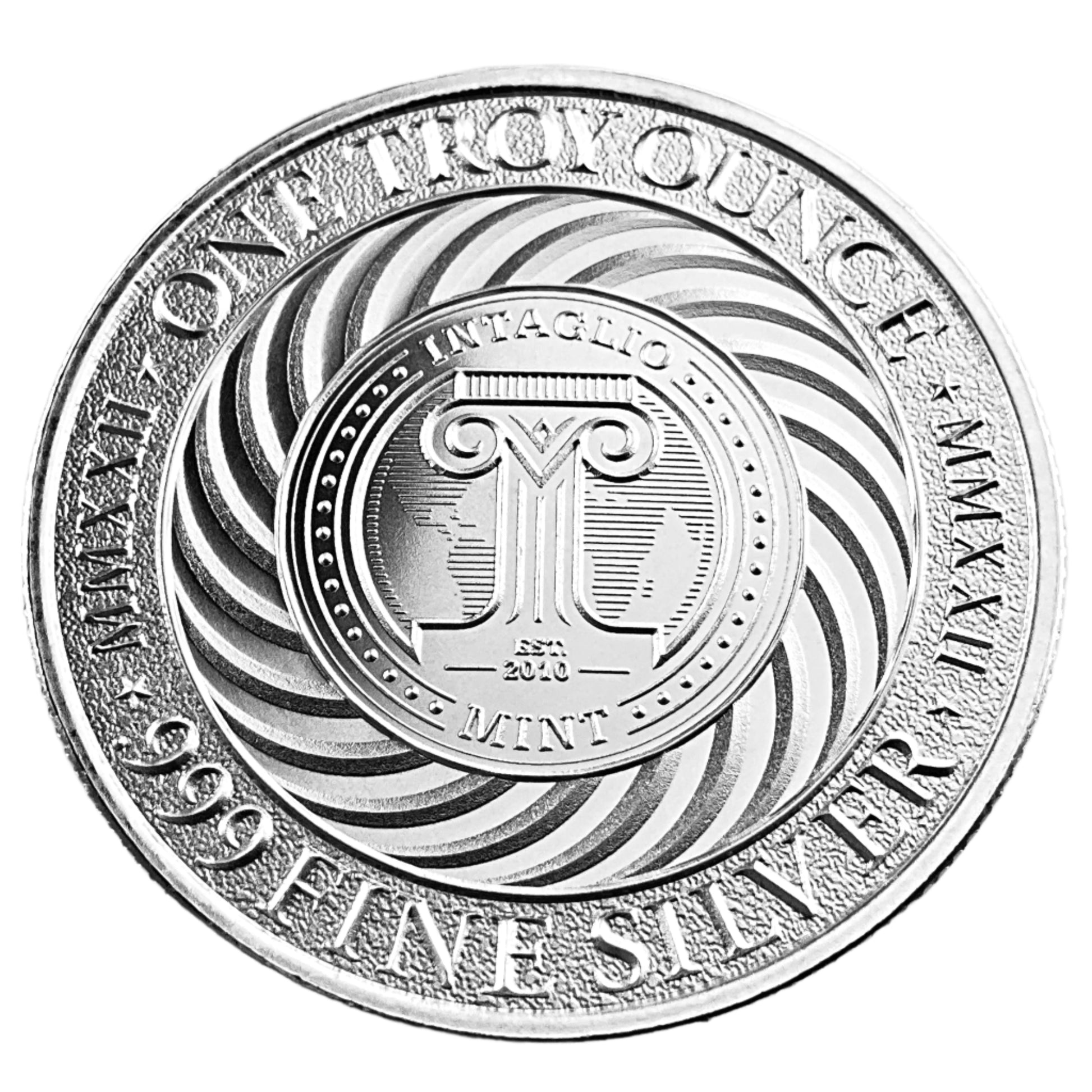 Displays a 1 oz .999 fine silver round featuring "The Unicorn" from the Cryptozoology Collection by Intaglio Mint.