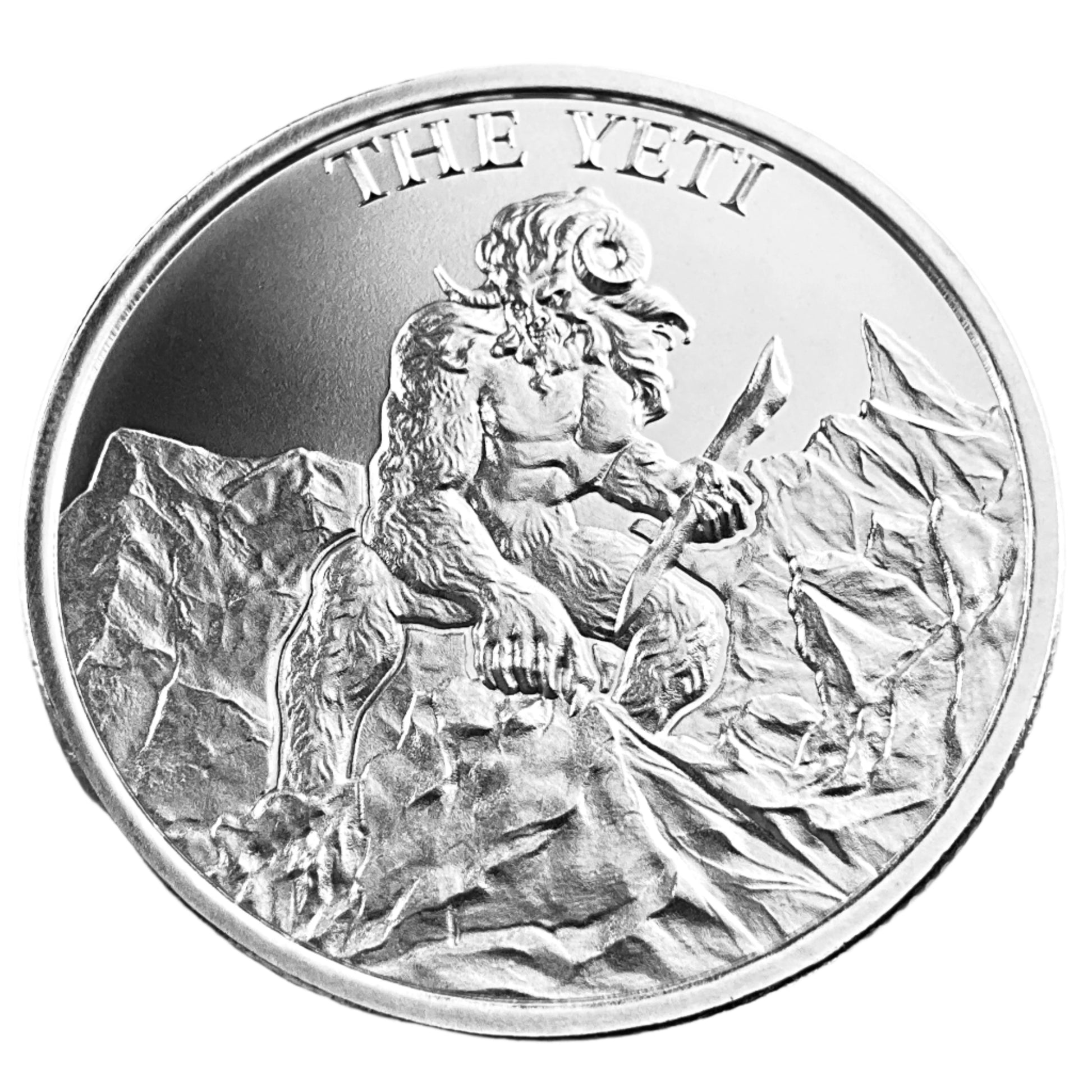 This silver round depicts the legendary Yeti, also known as the Abominable Snowman, a folkloric ape-like creature said to inhabit the Himalayan mountains.