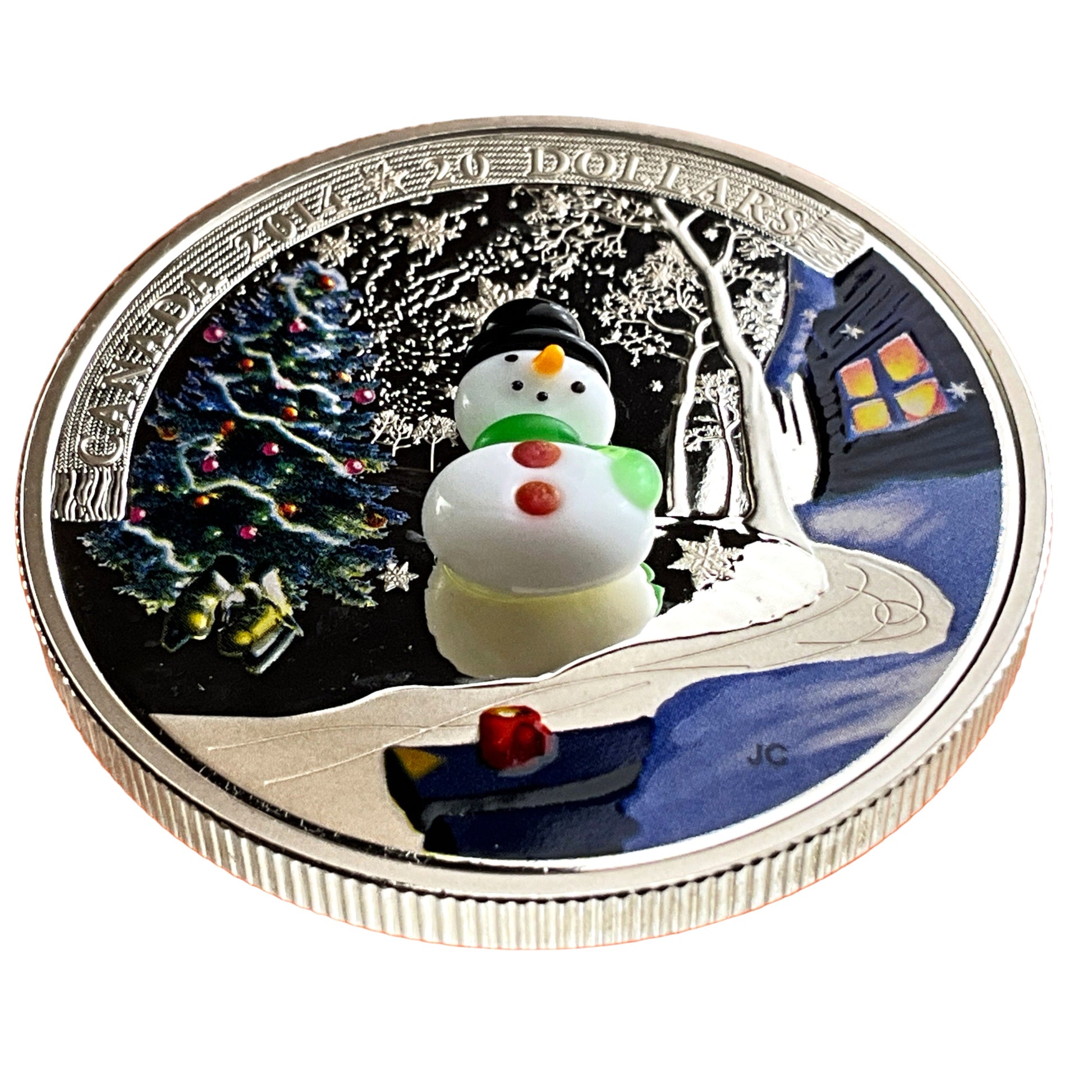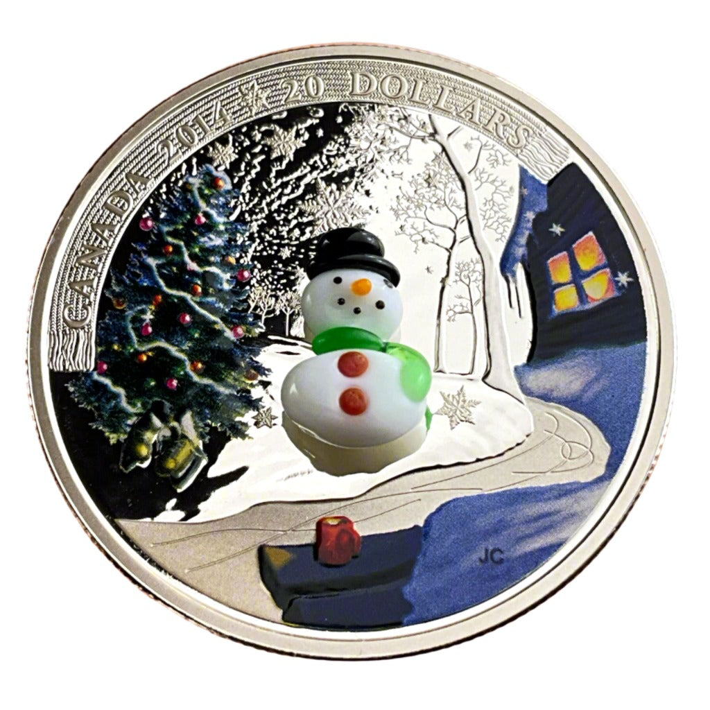 This is the 2014 Canada $20 Venetian Glass Snowman Fine Silver Coin.