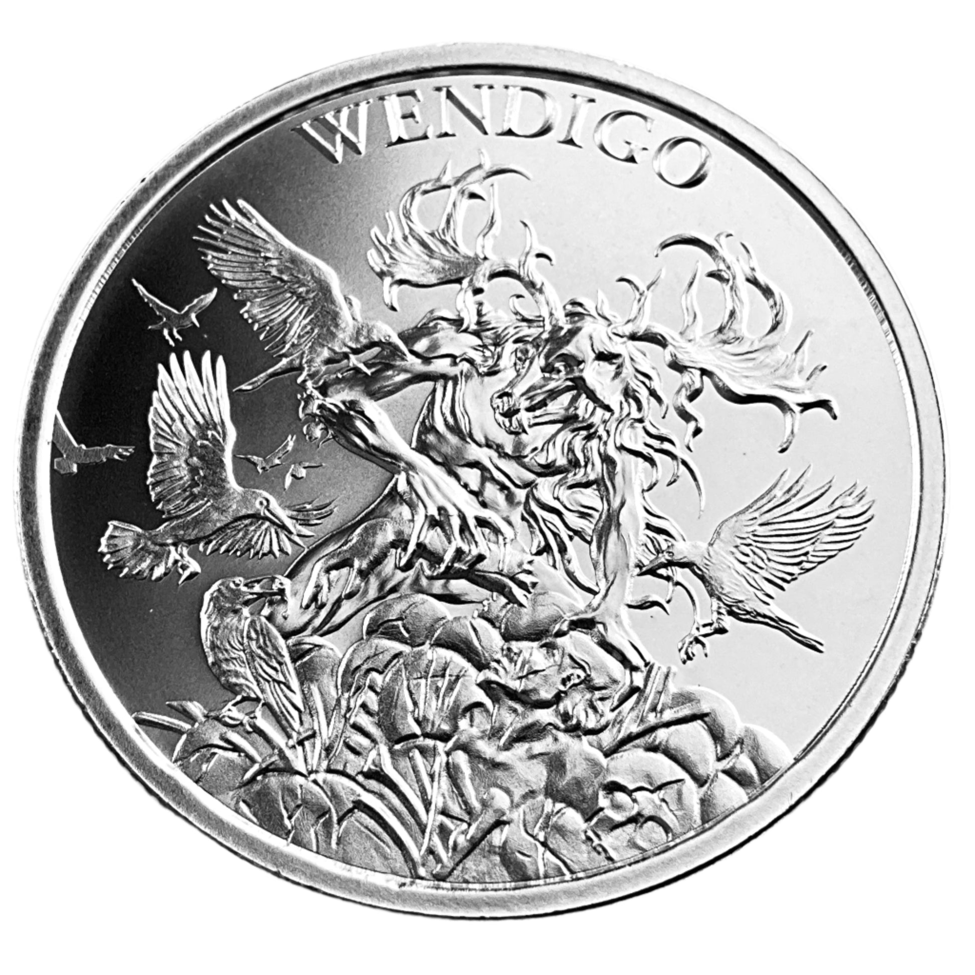 The coin features a detailed depiction of a creature with antlers and human-like features, embodying the Wendigo legend from Algonquian folklore.
