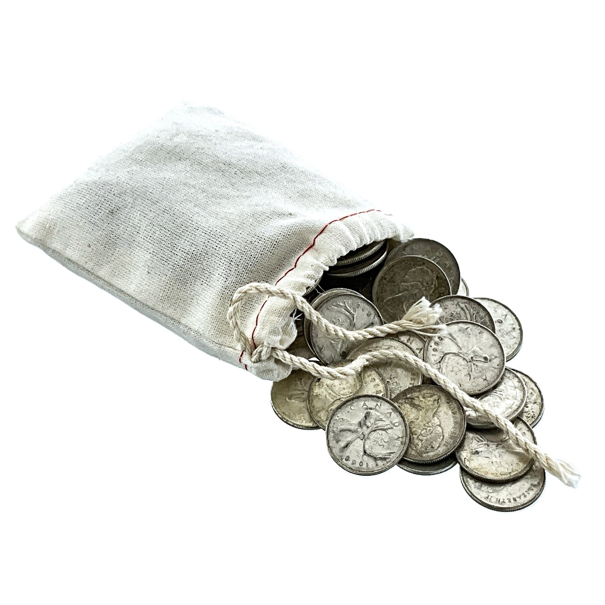 This is a bag of Canadian 25-cent pieces, also known as a quarter, featuring the caribou design. These coins are made of silver and have collectible value beyond their face value.