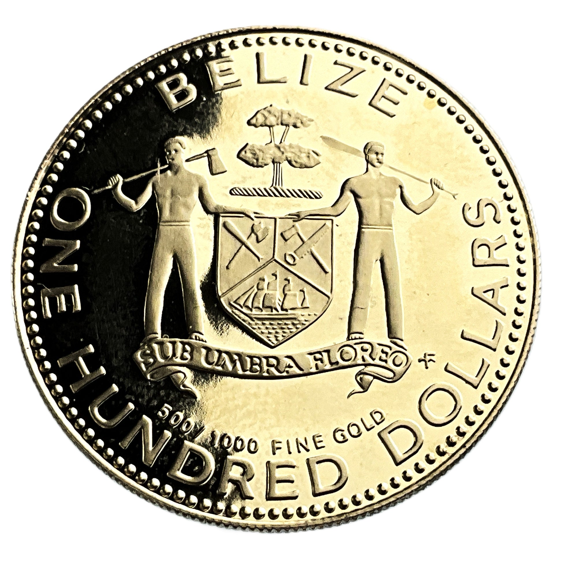 This is a 1976 Belize Gold 100 Dollar proof coin. This specific coin was part of Belize's first official gold proof series.