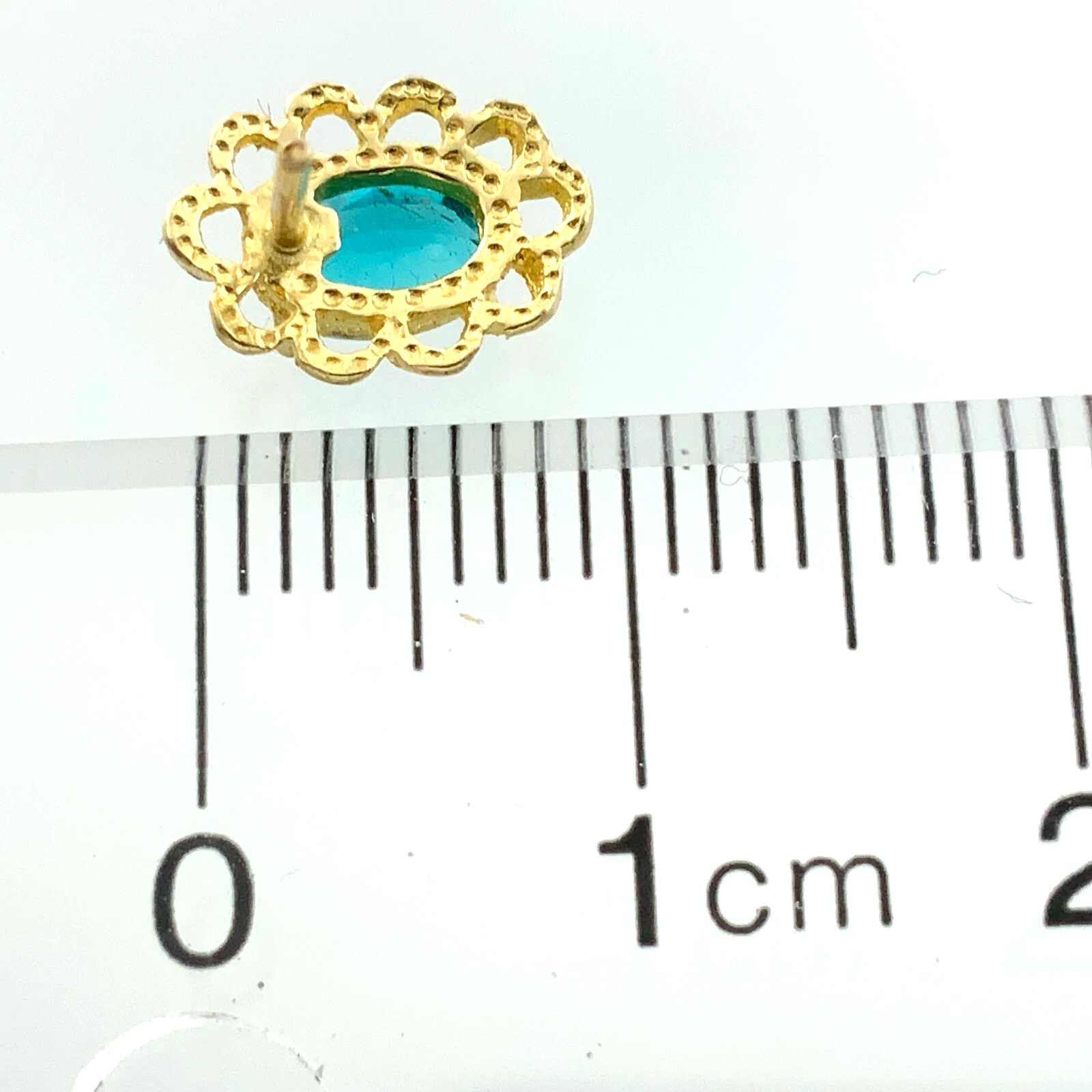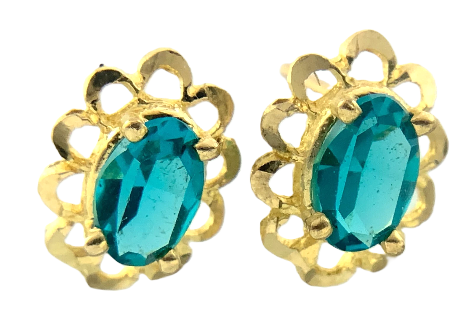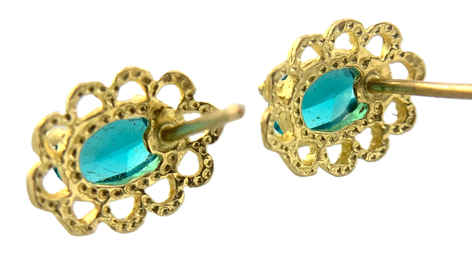 10K Yellow Gold Aqua Blue Rhinestone Scalloped Stud Earrings AU193