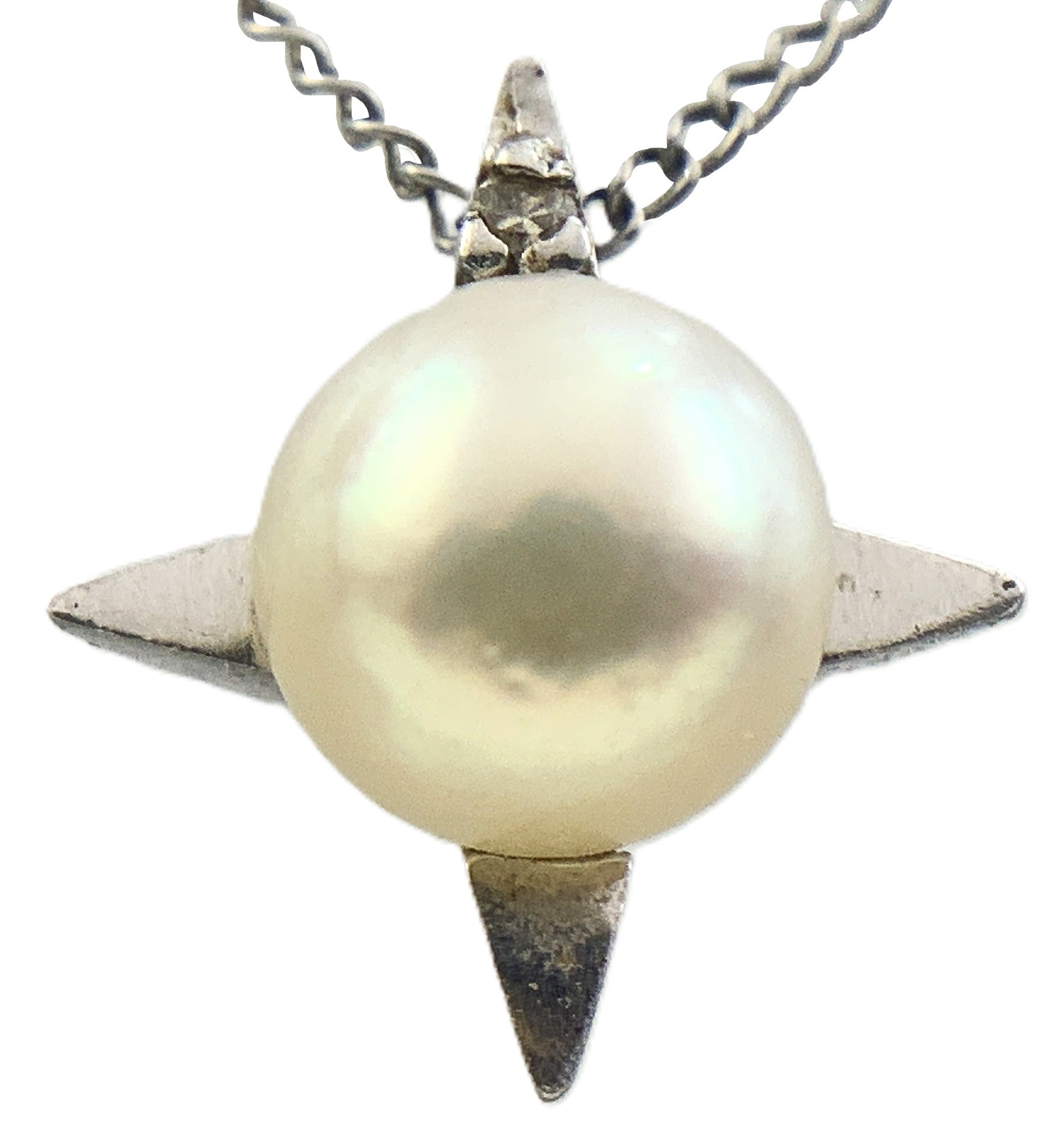 This is a pearl pendant necklace with a star-shaped setting and a white gold chain.