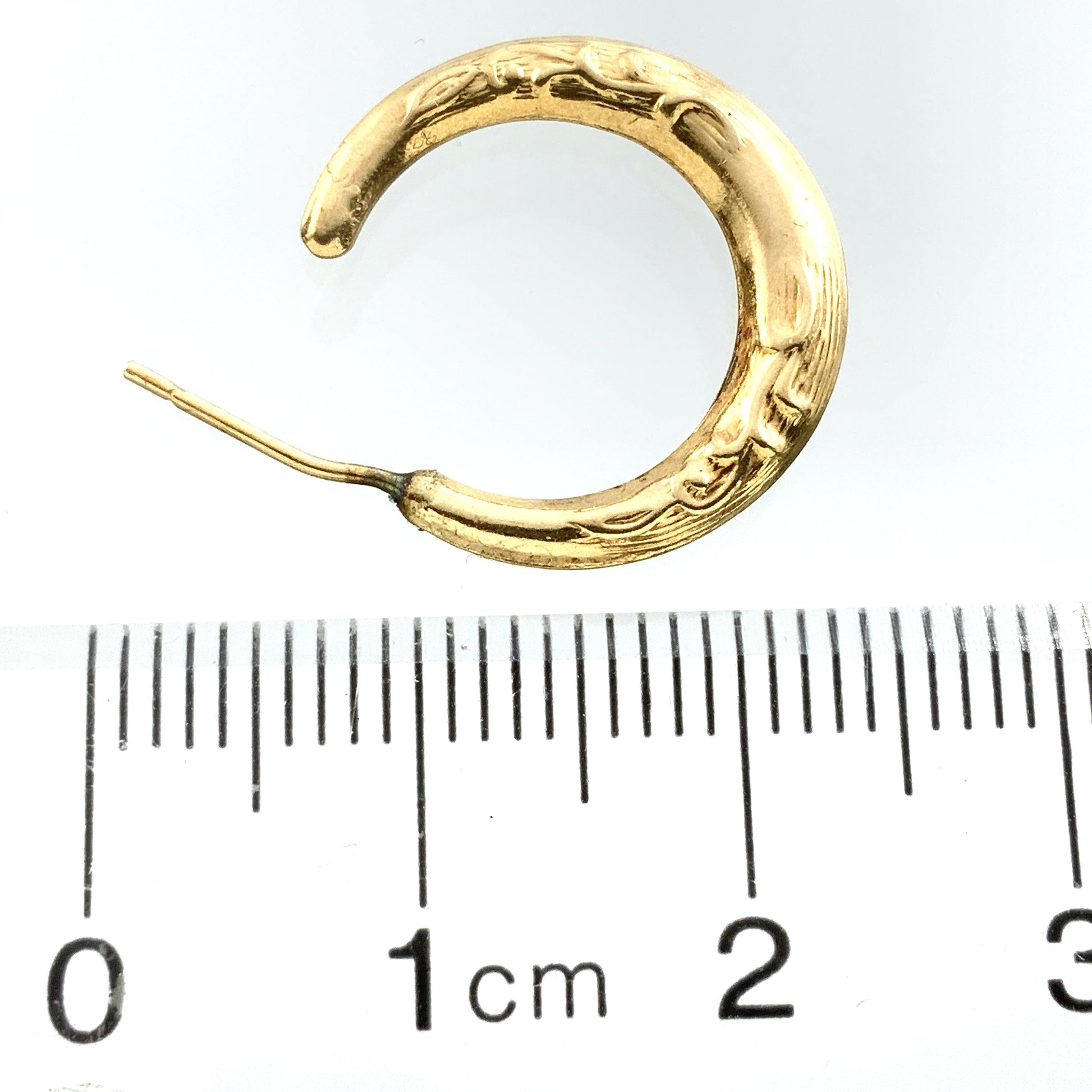 This is a pair of chunky gold hoop earrings with an engraved design.