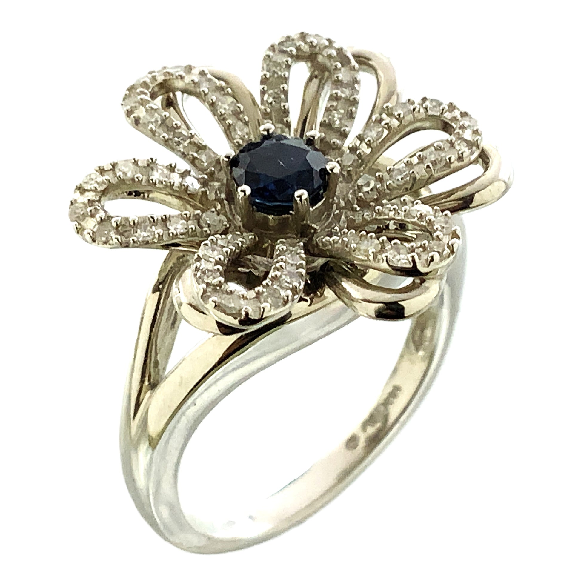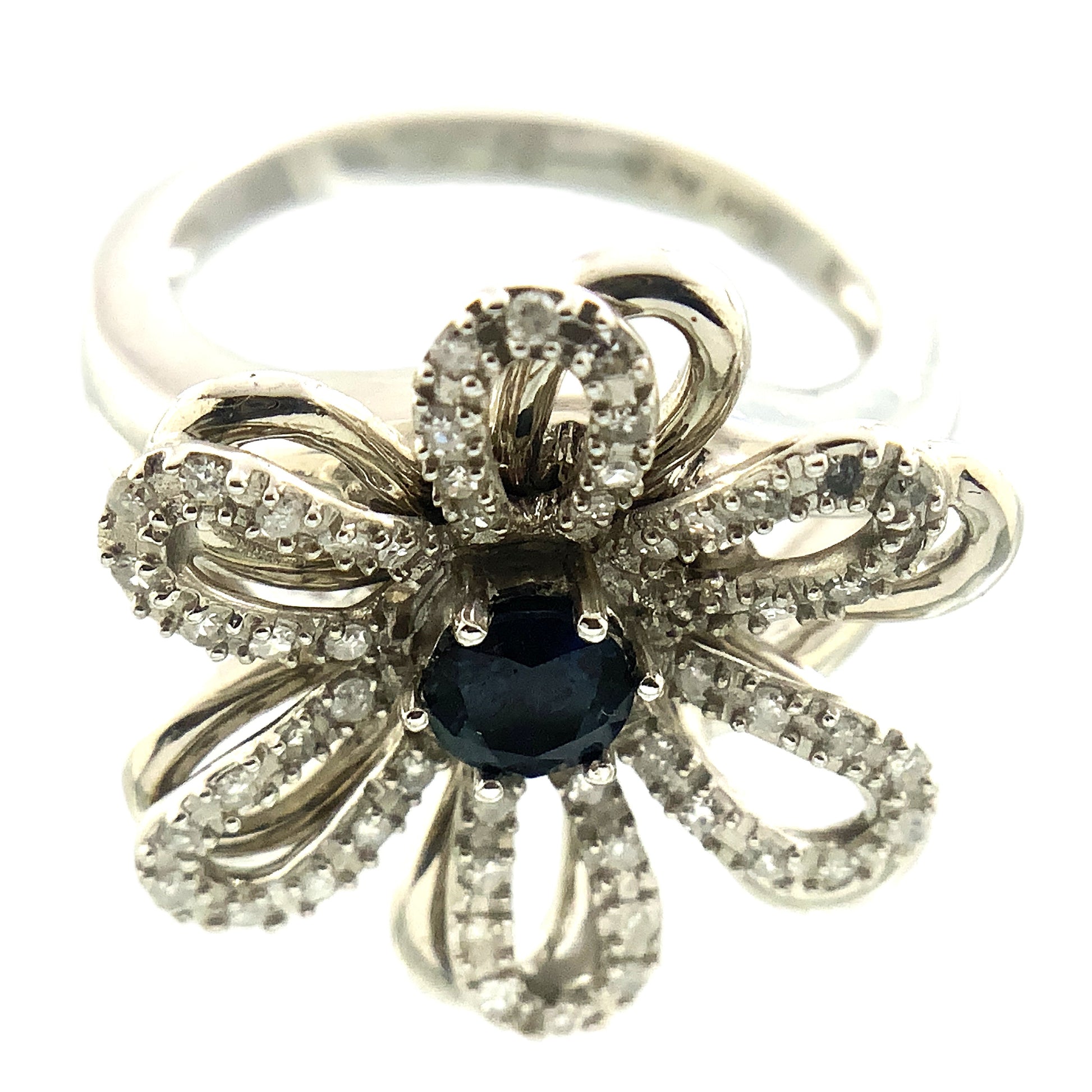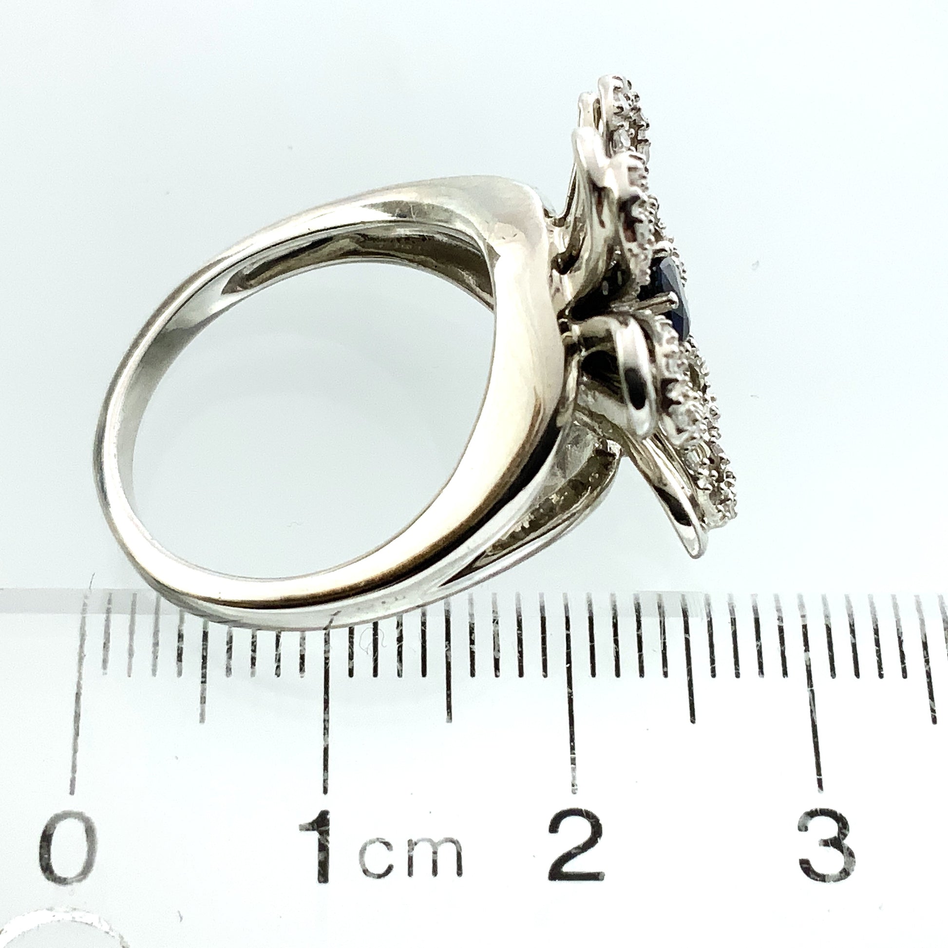 This item is a white gold ring featuring a central blue gemstone surrounded by smaller accent stones arranged in a floral or snowflake cluster design.