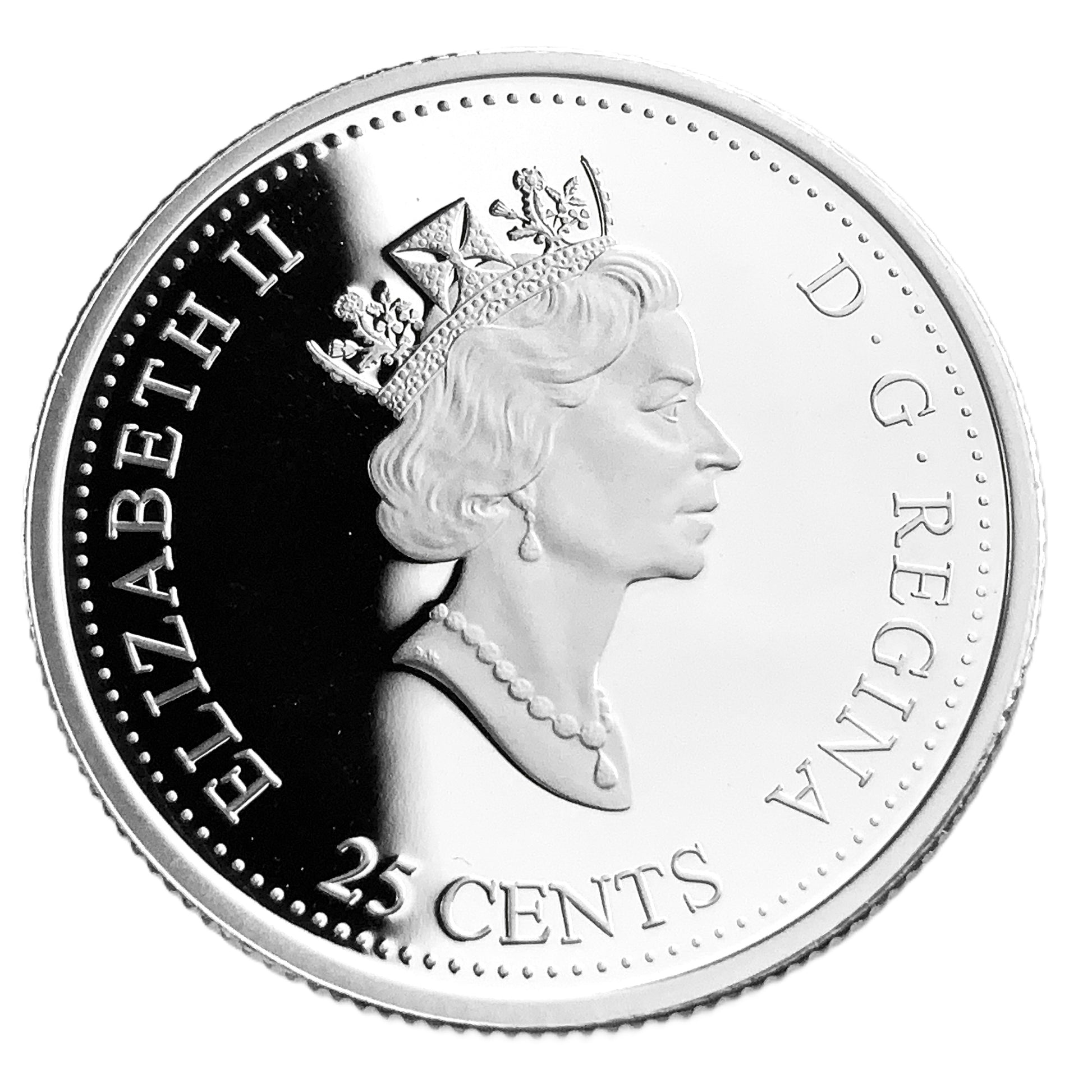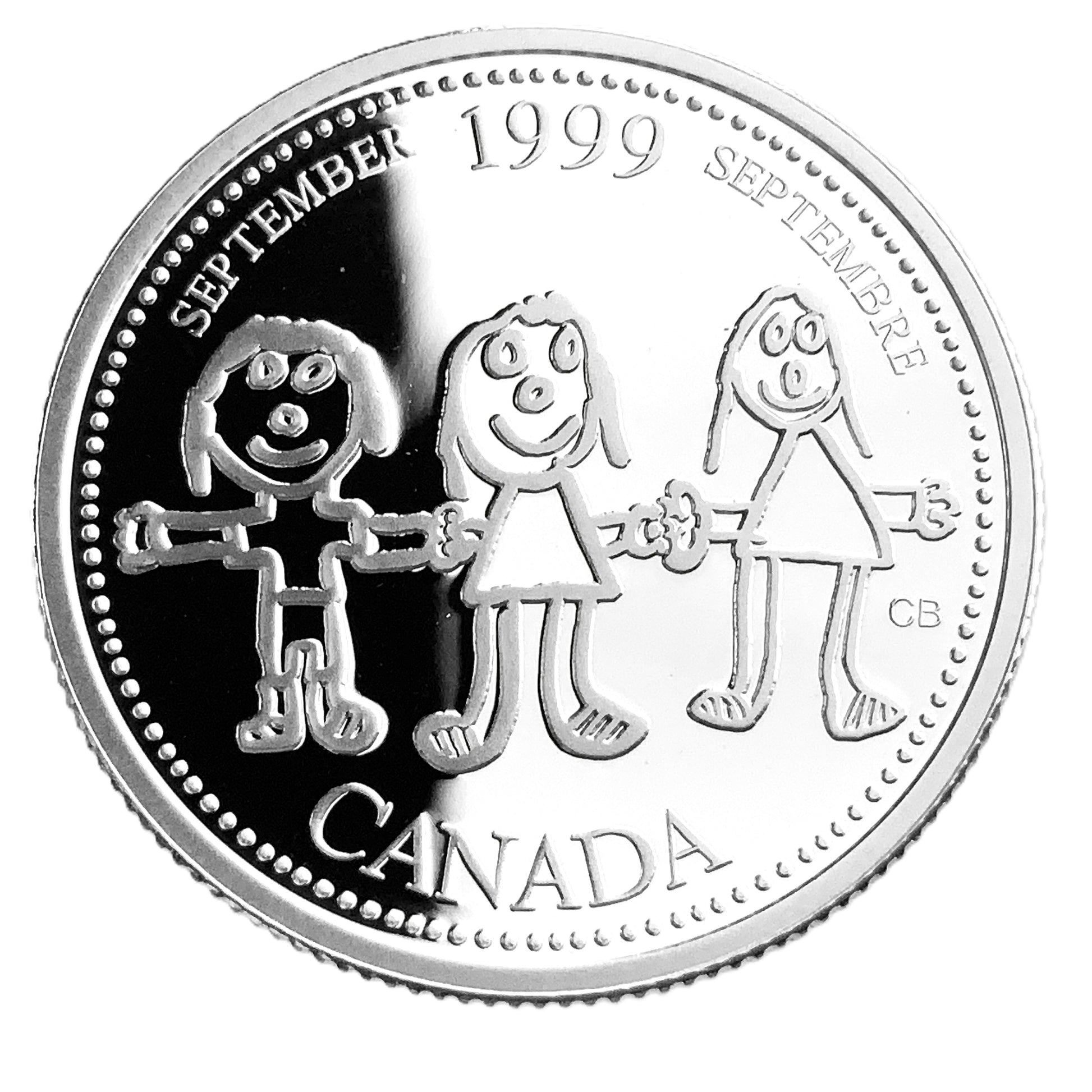 This is a September 1999 Canadian 25-cent coin from the "Millennium Quarter" series. The design, titled "Canada Through a Child's Eye," features three children holding hands, which represents peace and a united nation. The design was created by a child named Claudia Bernard (initials "CB" appear on the coin) as part of a nationwide contest held by the Royal Canadian Mint.