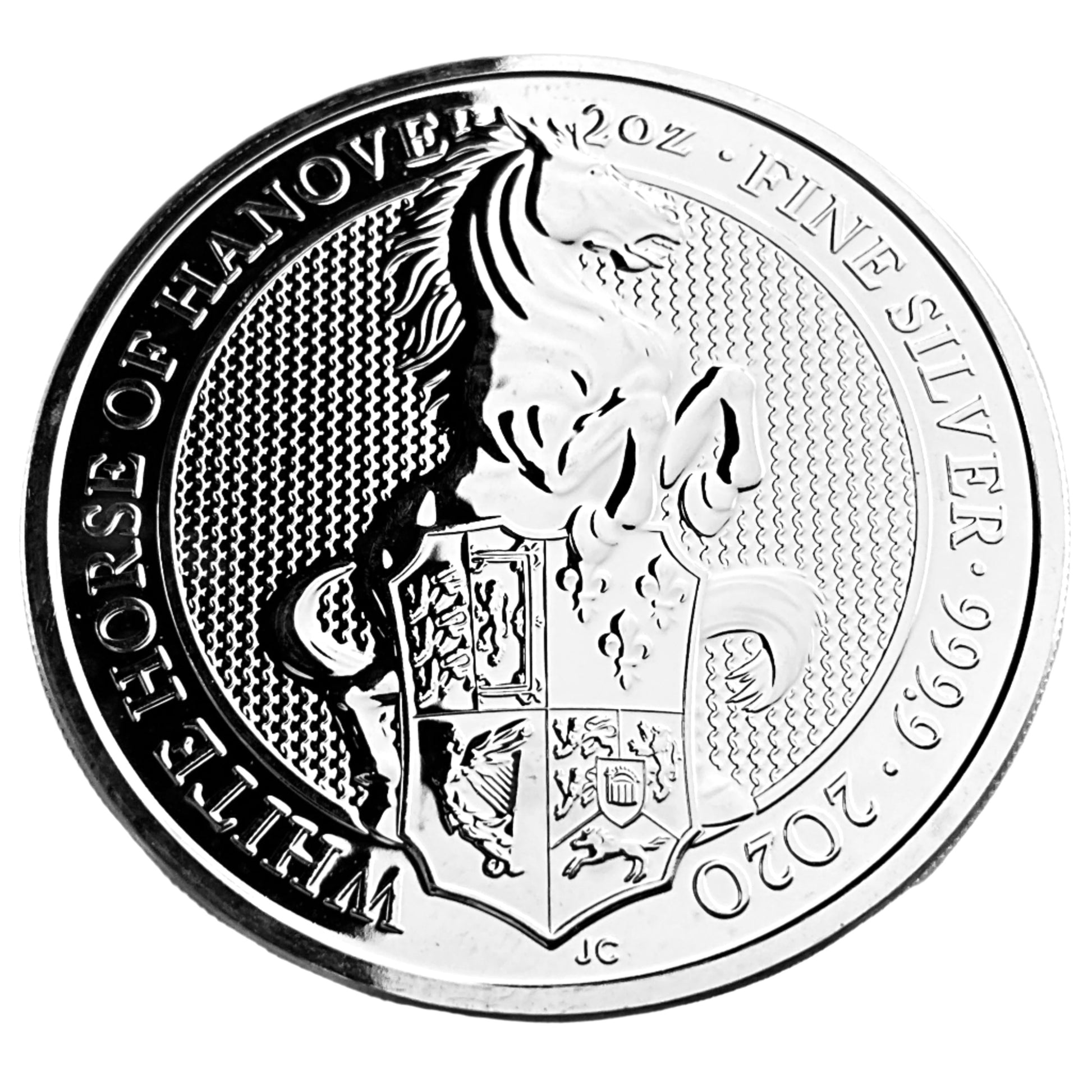 The image shows a 2020 2 oz Silver Queen's Beasts White Horse of Hanover coin, part of The Royal Mint's Queen's Beasts Collection.