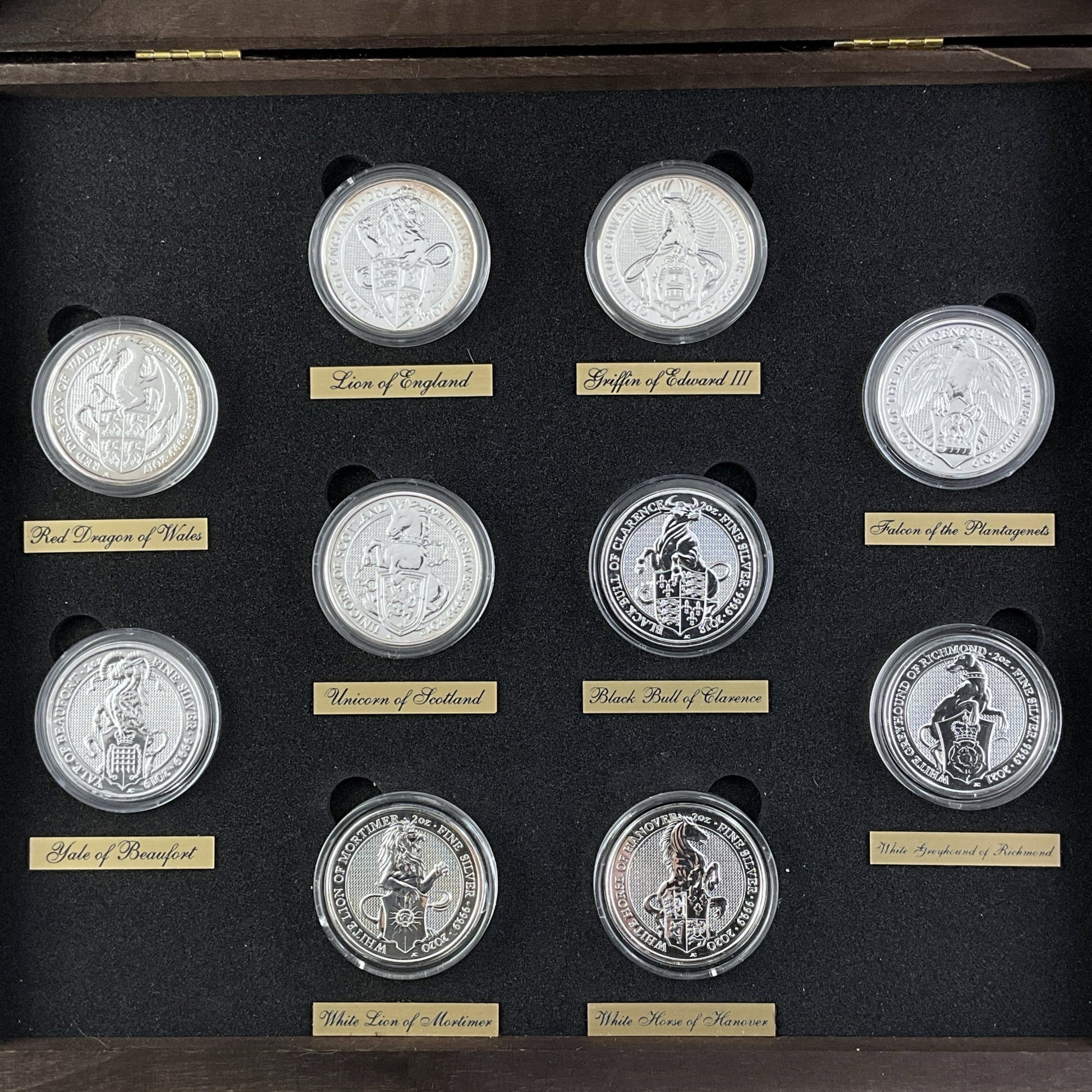 This image displays a collection of 2 oz silver Queen's Beasts coins from the British Royal Mint, housed in a presentation box.