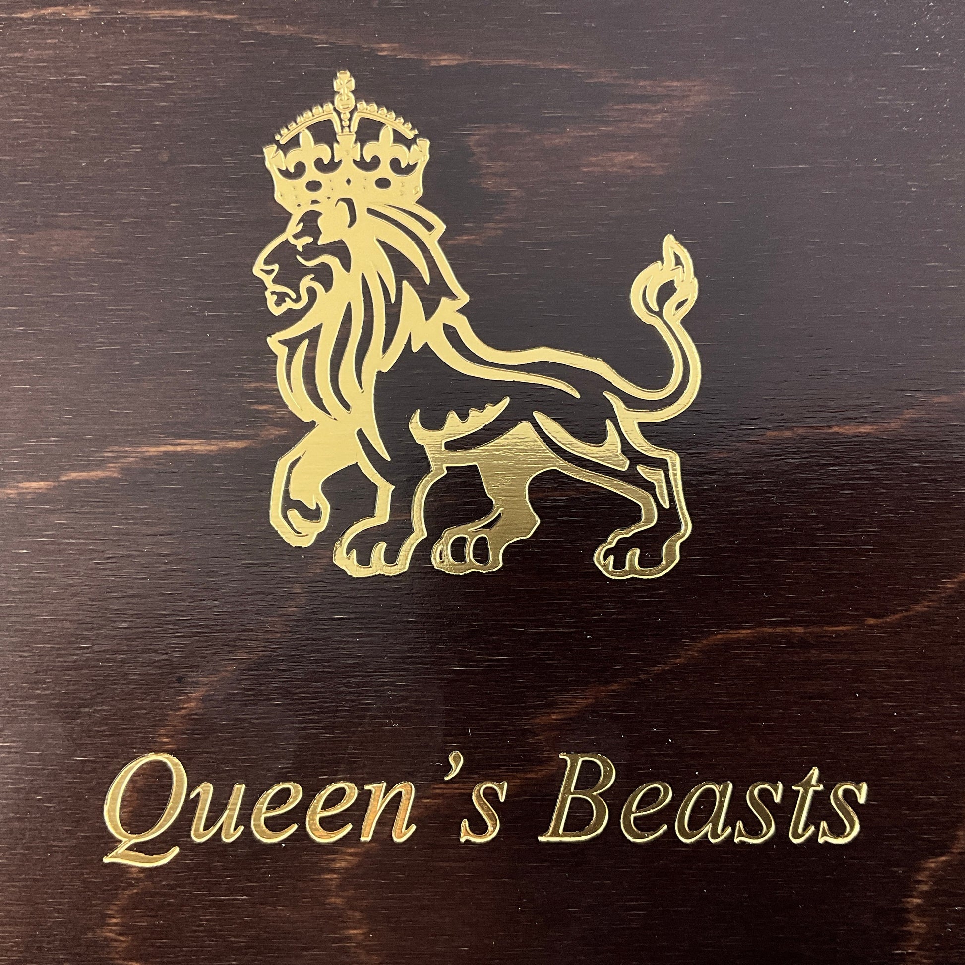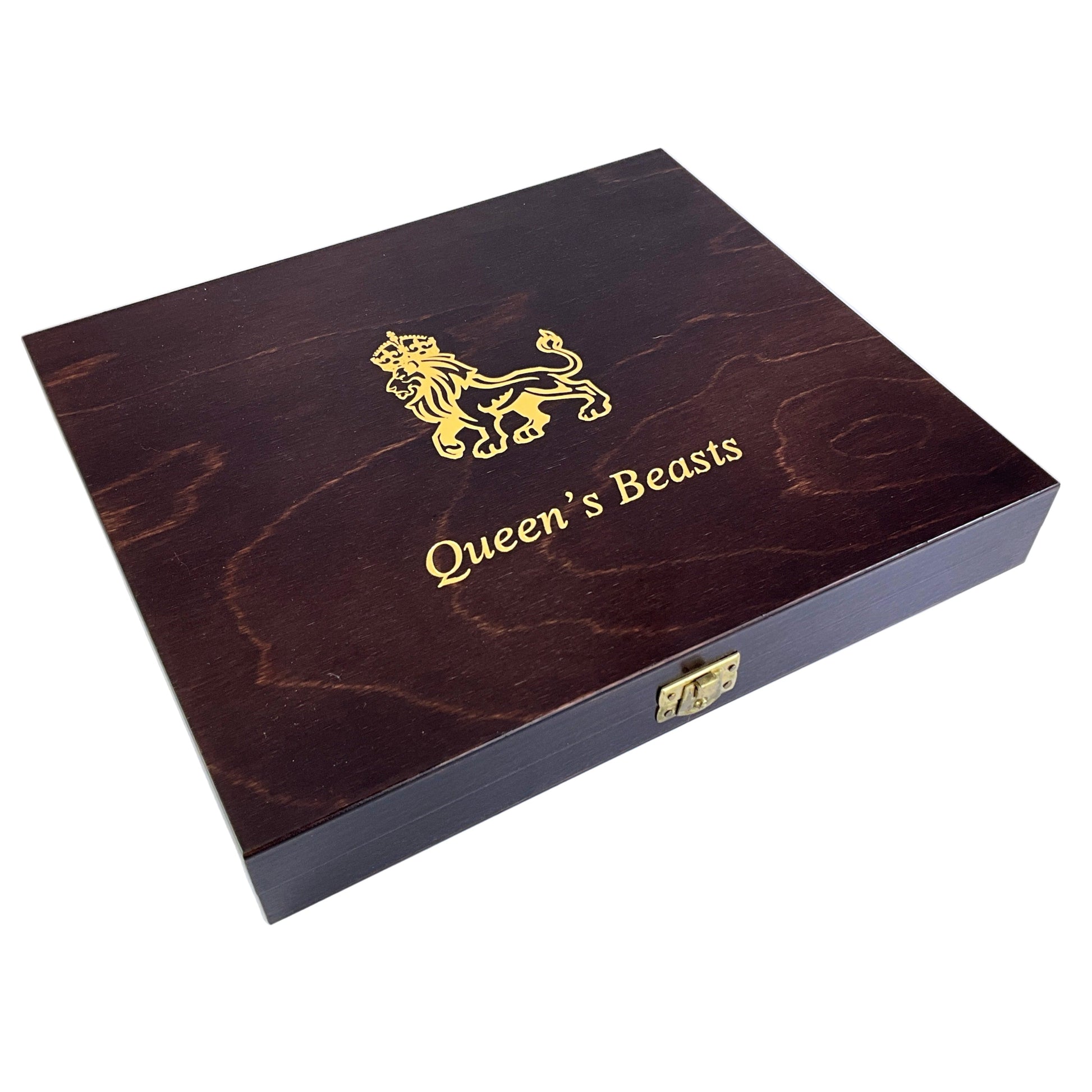 The set includes all ten Queen's Beasts coins, such as the Lion of England, Griffin of Edward III, Red Dragon of Wales, Unicorn of Scotland, Black Bull of Clarence, Falcon of the Plantagenets, Yale of Beaufort, White Greyhound of Richmond, White Lion of Mortimer, and White Horse of Hanover.