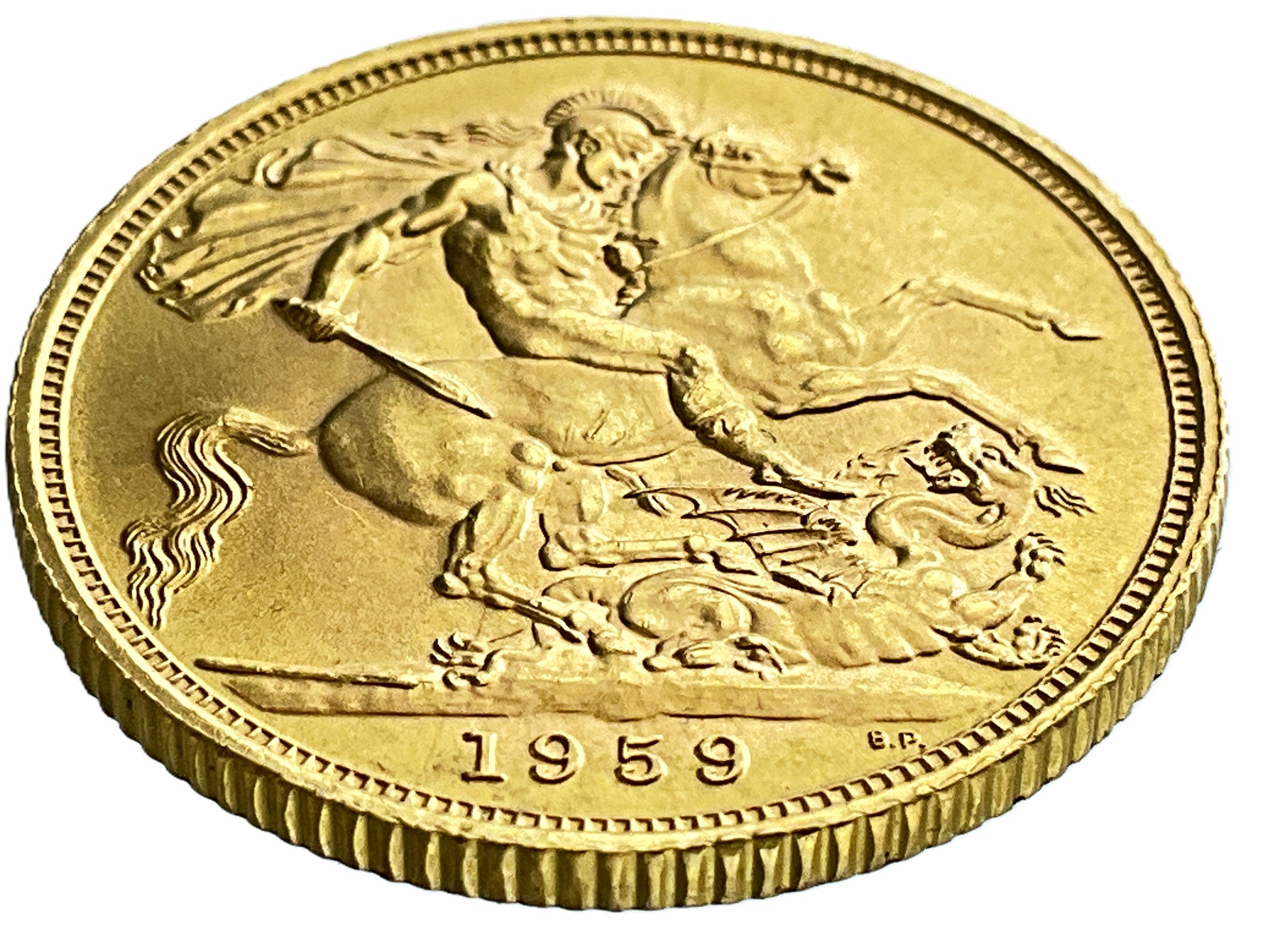 This is a 1959 Queen Elizabeth II Gold Full Sovereign. This iconic British gold coin features the classic "George and Dragon" design by Benedetto Pistrucci, which depicts Saint George slaying a dragon.