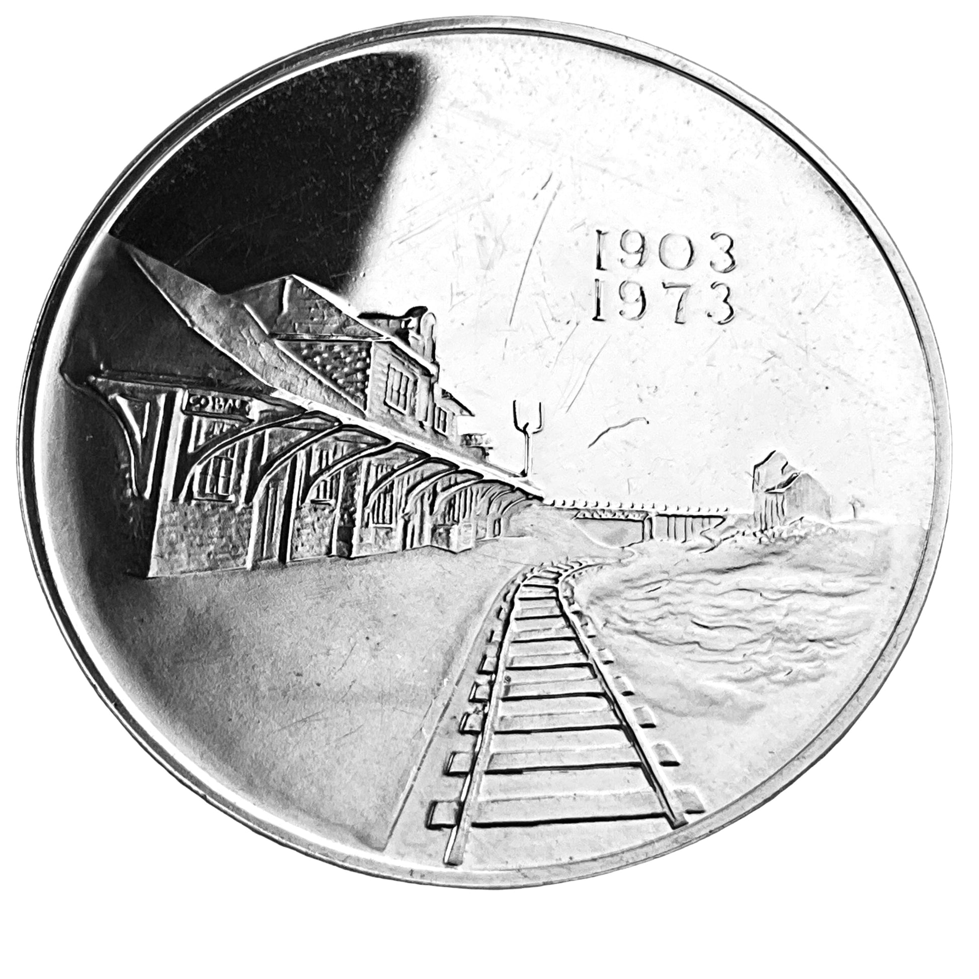 Design: The medallion depicts a railway station and tracks, with the dates "1903" and "1973" inscribed, highlighting Cobalt's mining and railway history.