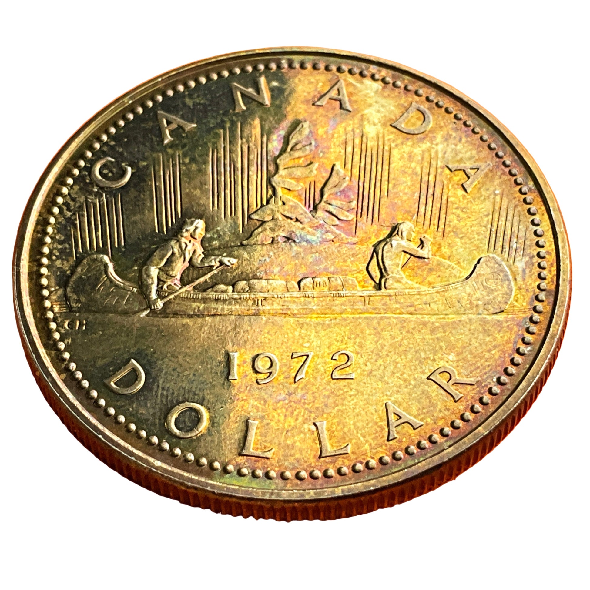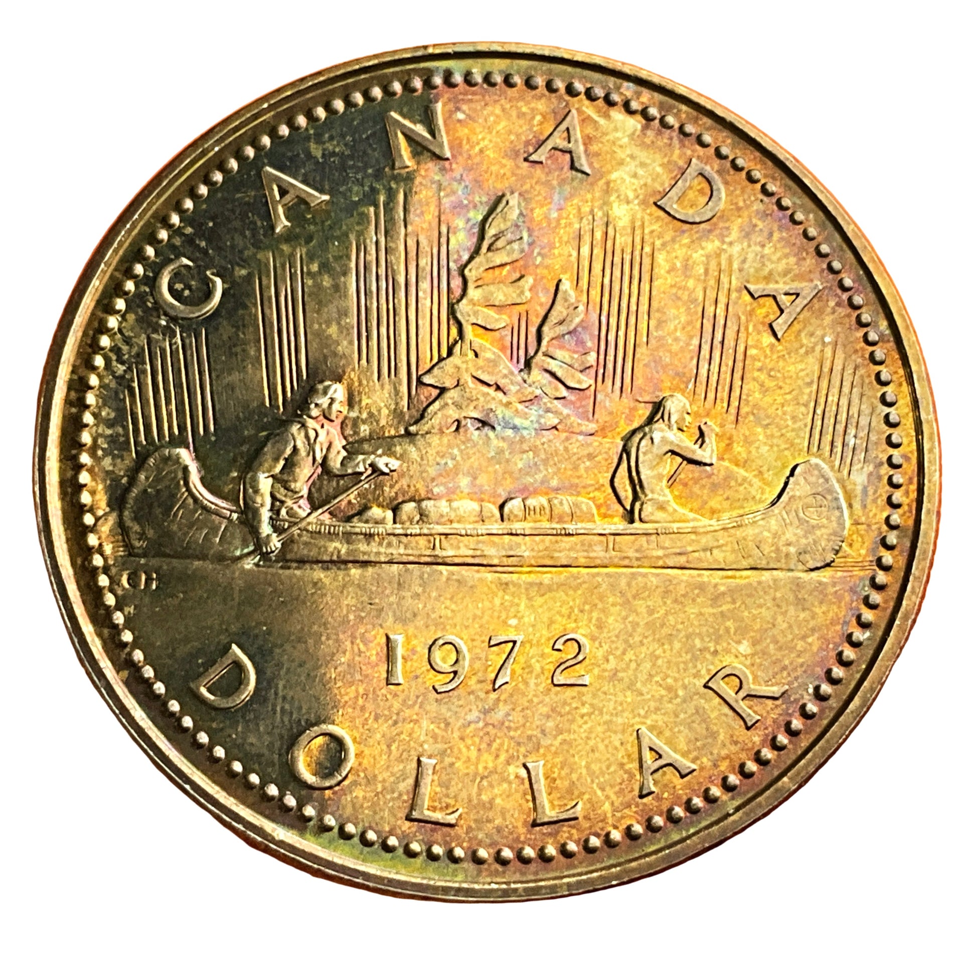 While the design is based on the original "Voyageur Dollar" from 1935, the 1972 coin would have been minted with a different composition than the earlier silver versions, as the Royal Canadian Mint changed the composition of its circulation coins after 1967.